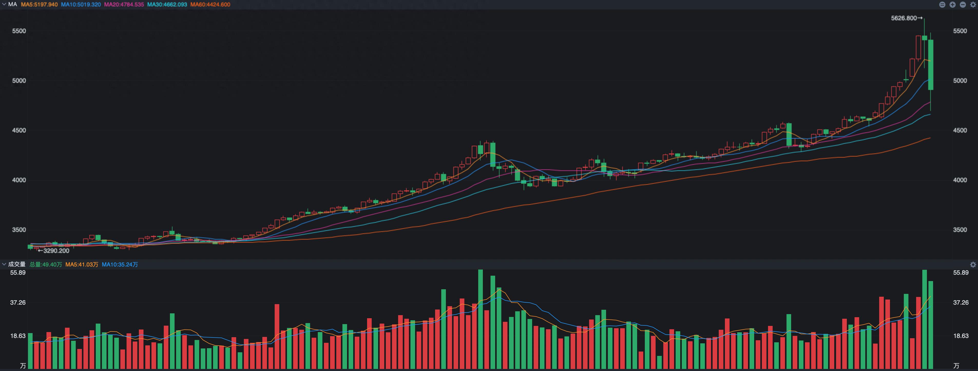 再看纽约黄金期货也是相当的惨烈,昨天盘中高点5400美元,最低点到了4700美元,昨夜的最大跌幅达到了12%,这波黄金的加速走势是从1月19日开始,大概是4600美元,也就是说黄金加速上涨这段看起来很美,如果你现在还持有的话,也是一场空欢喜。