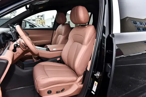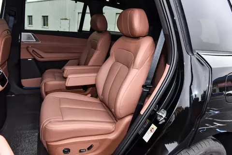 在座椅配置和舒适性方面,旗舰型相比尊荣型有显著升级。原车座椅是仿皮材质,可以选装Nappa真皮座椅。副驾座椅升级为零重力座椅,并带有电动腿托;第二排右侧的“女王座椅”也配备了电动腿托,两个座椅均支持通风/加热/按摩功能。第二排过道宽度可达到277mm,加上1.3米的车内高度,方便老人孩子进出第三排。并且配备了双小桌板,满足用餐、办公、学习等需求。第三排座椅并非摆设,它不仅支持100毫米的前后滑动和最.大121度的靠背角度调节,还配备座椅加热和独立的空调出风口,提升长途乘坐的实用性。内饰提供云锦米、金山棕和铂檀灰三种选择,其中云锦米配色更显温馨,适合多成员家庭。