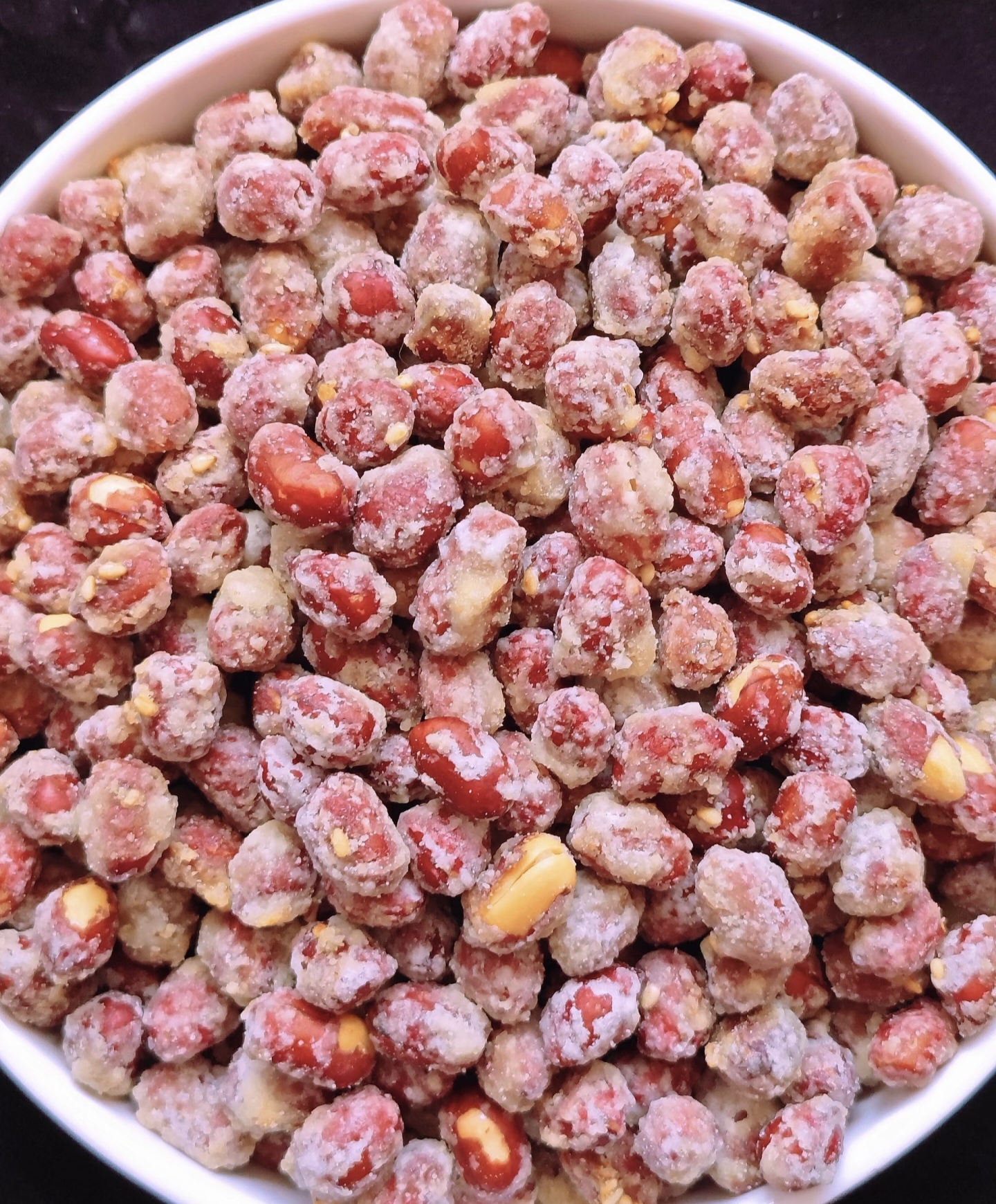 倒入花生后迅速翻炒,让每颗花生都裹上糖液(像给花生穿透明雨衣),保持小火持续翻炒,你会看到糖液逐渐变白、起沙(这个过程像在下雪,超治愈!),当花生表面出现均匀白霜时,立刻关火(继续炒会变成焦糖花生!),快速将花生摊开在油纸上(用筷子拨散防粘连),趁热撒点熟白芝麻(增香又好看)。