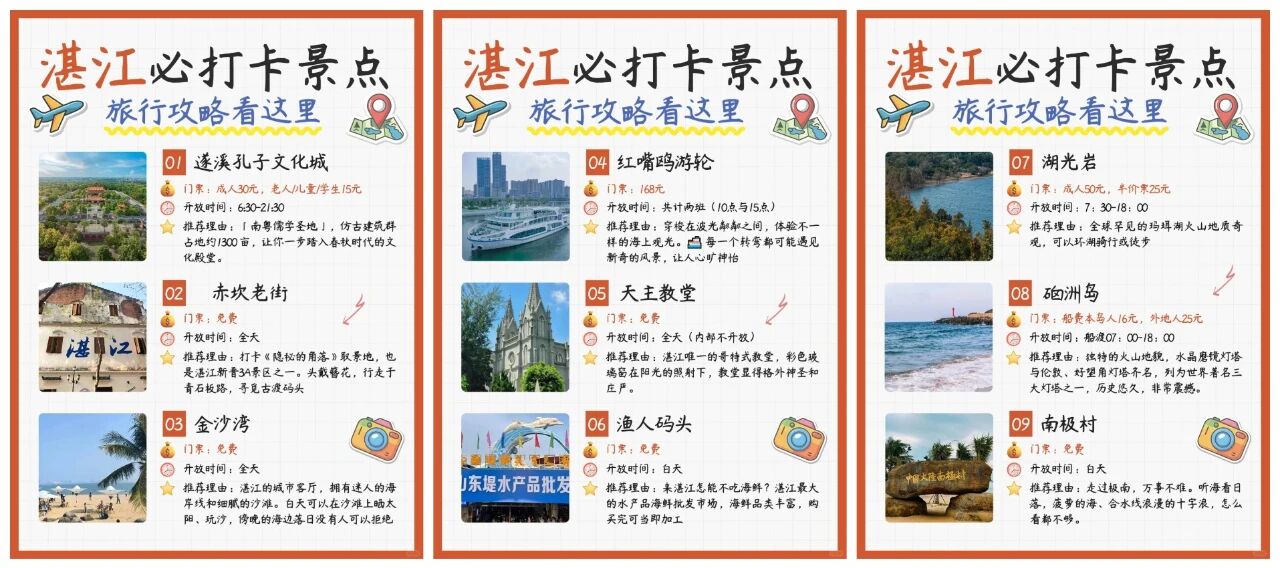 🚗交通攻略:各地飞往湛江吴川机场,机票常年300+;市区内公交、共享单车出行便捷;去硇洲岛需从东南码头乘船,船票40元/人。