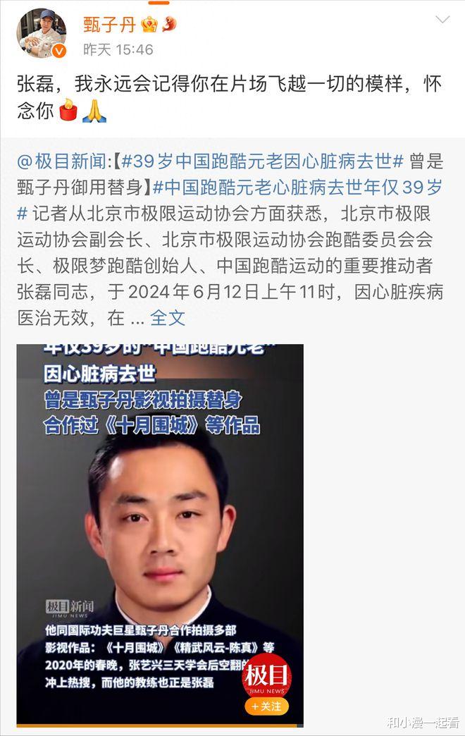 近日,甄子丹发文悼念替身演员张磊,这位跑酷元老竟英年早逝,年仅39岁。他的不幸遭遇,引发人们对替身演员群体的关注和思考。