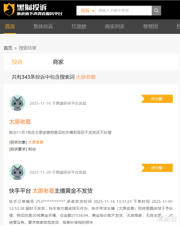 截至11月22日,黑猫投诉平台上与“太原老葛”相关的投诉已达343条,其中也有关于“黄金不发货”的。