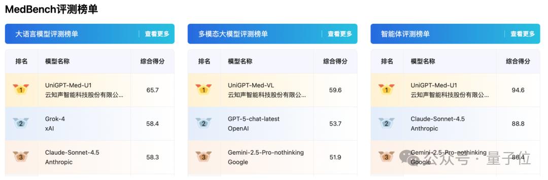 现在打开MedBench官网,依旧是云知声的UniGPT-Med系列模型三榜夺魁。