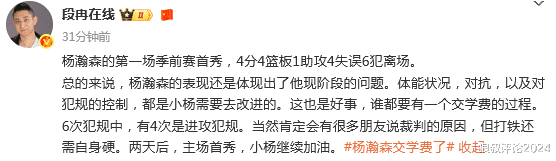 这也是好事,谁都要有一个交学费的过程。6次犯规中,有4次是进攻犯规。当然肯定会有很多朋友说裁判的原因,但打铁还需自身硬。两天后,主场首秀,小杨继续加油。”