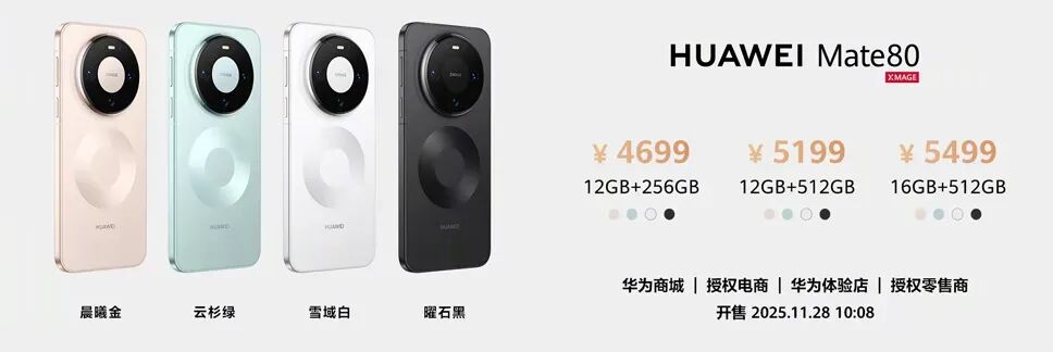 华为Mate 80全系产品都将在11月28日10:08正式开售。
