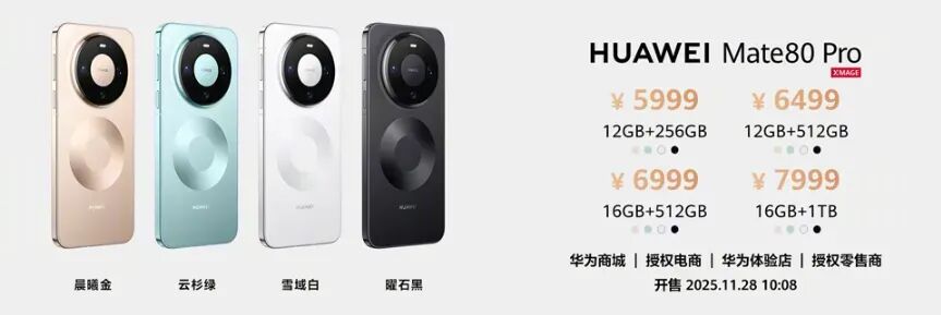 华为Mate 80 Pro提供曜石黑、雪域白、晨曦金和云杉绿四色可选,12GB+256GB版本5999元;12GB+512GB版本6499元;16GB+512GB版本6999元;16GB+1TB版本7999元。