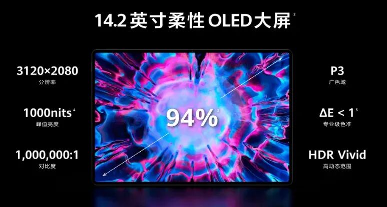 华为MatePad Edge鸿蒙二合一平板电脑采用14.2英寸柔性OLED云晰柔光屏,采用无刘海、四边等距设计,4.1mm的超窄边框带来高达94%的屏占比。3.1K超高分辨率清晰细腻、120Hz高刷新率流畅丝滑、1000nits峰值亮度,并且在P3和sRGB色域下均有∆E<1的专业级色准表现。