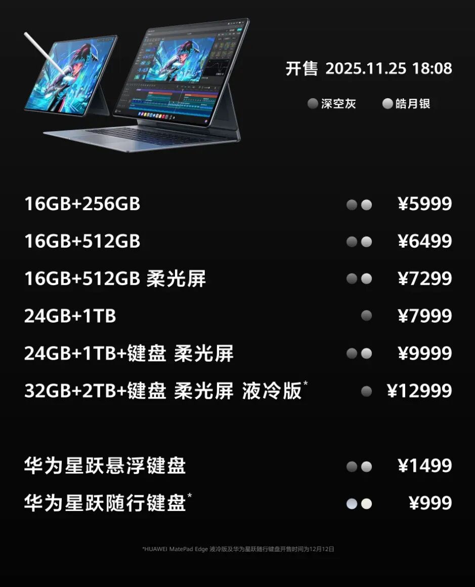 售价方面,16GB+256GB版本5999元;16GB+512GB版本6499元;16GB+512GB柔光屏7299元;24GB+1TB版本7999元;24GB+1TB+键盘 柔光屏9999元;32GB+2TB键盘 柔光屏 液冷版12999元。