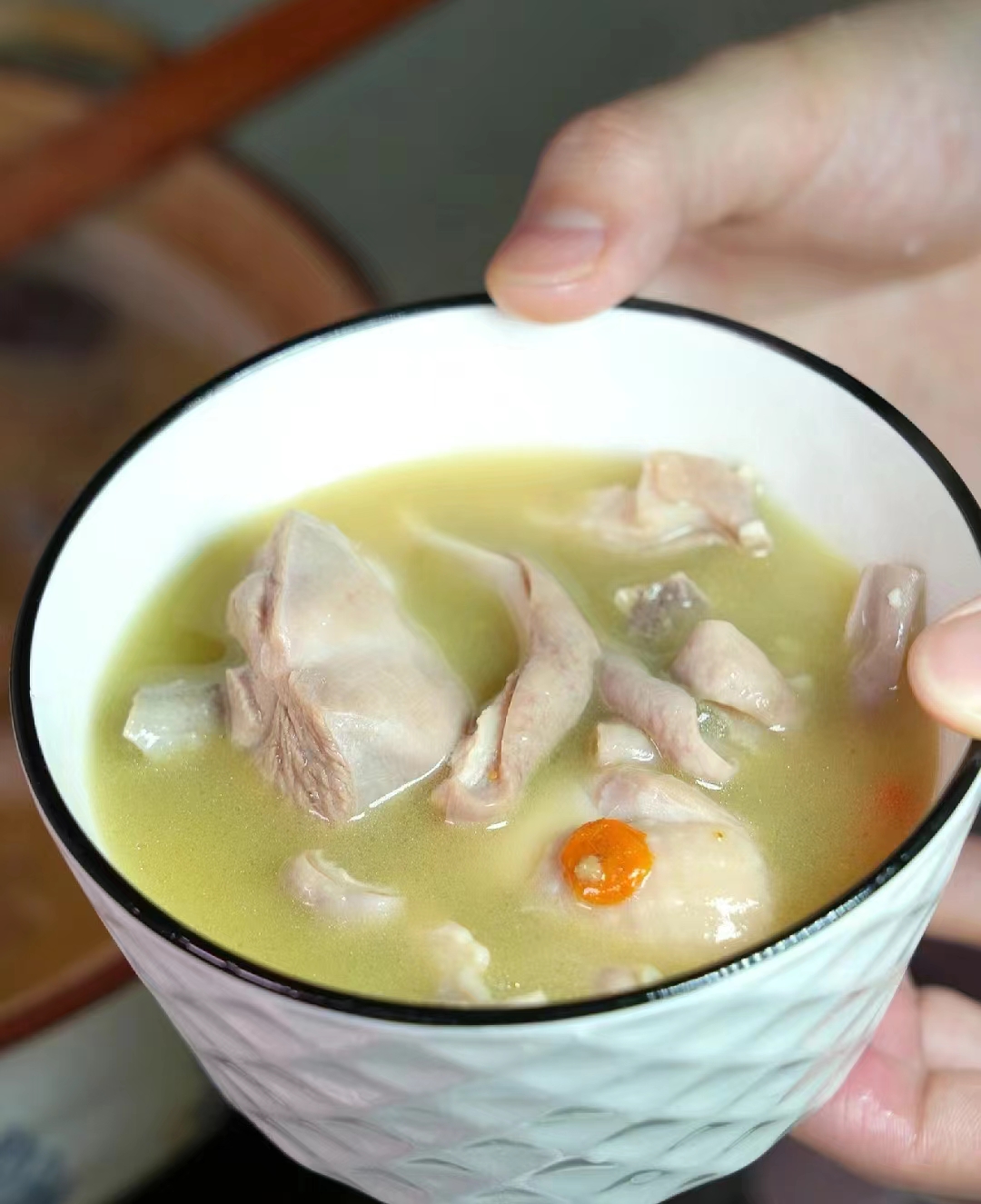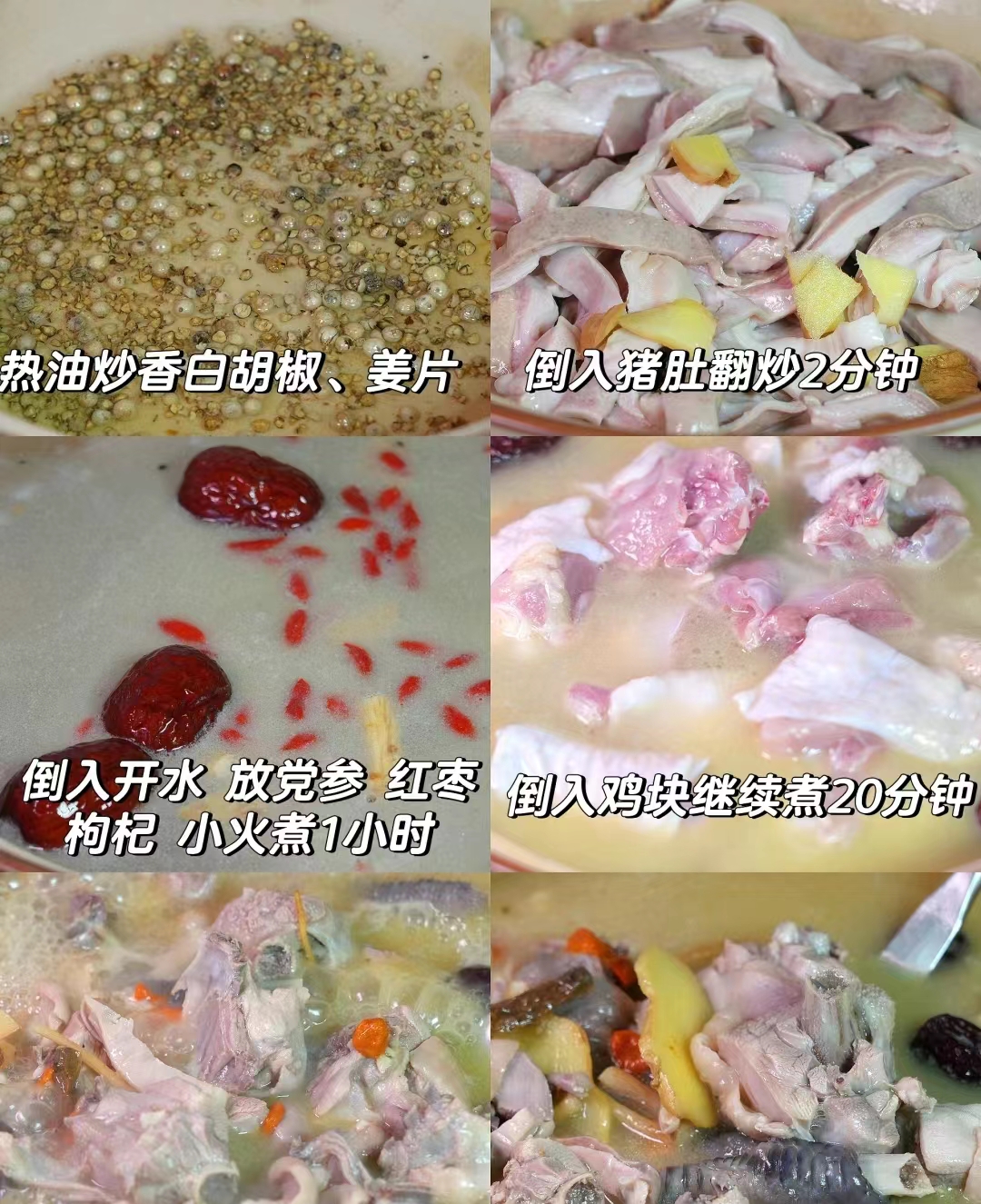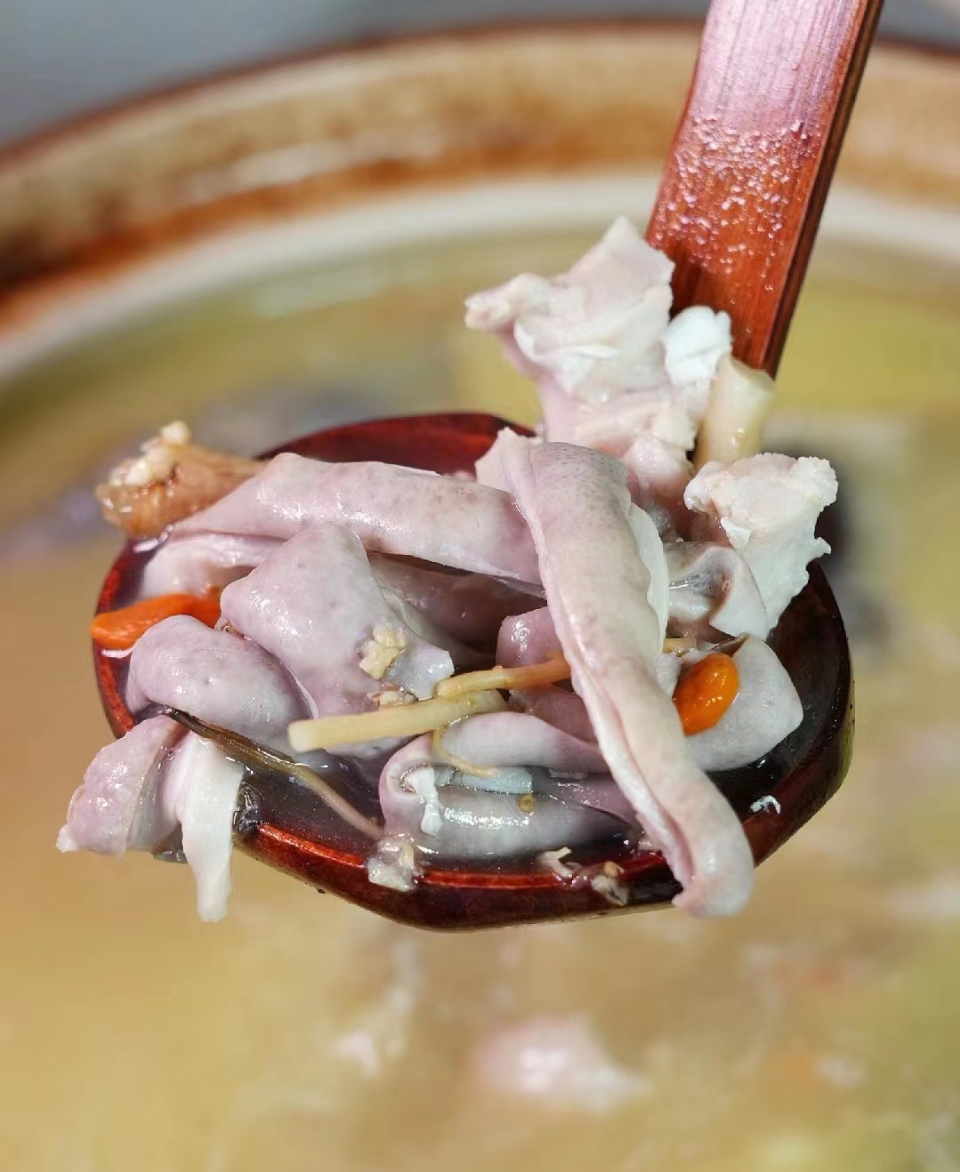 猪肚鸡的制作需要选用新鲜的猪肚和嫩滑的鸡肉,再加上各种香料和调味料,经过炖煮的过程,使得鸡肉入味、猪肚鲜嫩,形成了独特的口感和风味。猪肚的独特质地能够吸收汤汁的浓郁味道,使得整道菜更加鲜香可口。 在烹饪过程中,人们常常会加入一些中草药,如枸杞、黄耆、淮山等,以增加猪肚鸡的滋补功效。这些中草药不仅能够增强鸡肉的鲜美味道,还具有补气养血、健脾益胃的功效,对身体有益无害。猪肚鸡汤的食用方法多种多样,可以单独品尝,也可以搭配米饭和一些面条食用。这样还比较下饭,而且猪肚鸡的汤汁鲜美浓郁,肉质鲜嫩多汁,每一口都能让人感受到温暖和满足。尤其是在下雨天,品尝一碗热腾腾的猪肚鸡汤,不仅能驱寒暖胃,更能带来一份舒适和宁静。