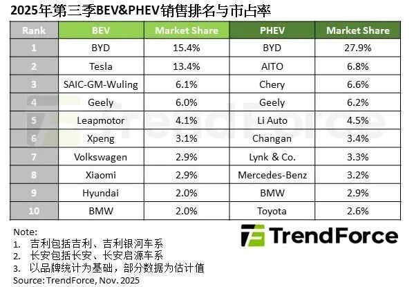 插混市场方面,比亚迪位列第一,但面临中国市场的饱和与激烈竞争,第三季度销量虽有环比增长但出现同比衰退。问界、奇瑞和吉利排名上升为第二至第四名,奇瑞销量爬升速度最快,第三季度市占率增加至6.6%。该机构预估今年全球新能源车销量将达2,043万辆,同比增长约25%。展望2026年,由于各地区补贴政策与优惠条件的差异调整,全球电动化进程分化将加剧,但预计全球新能源车销量仍将增至2,280万辆,同比增长12%。