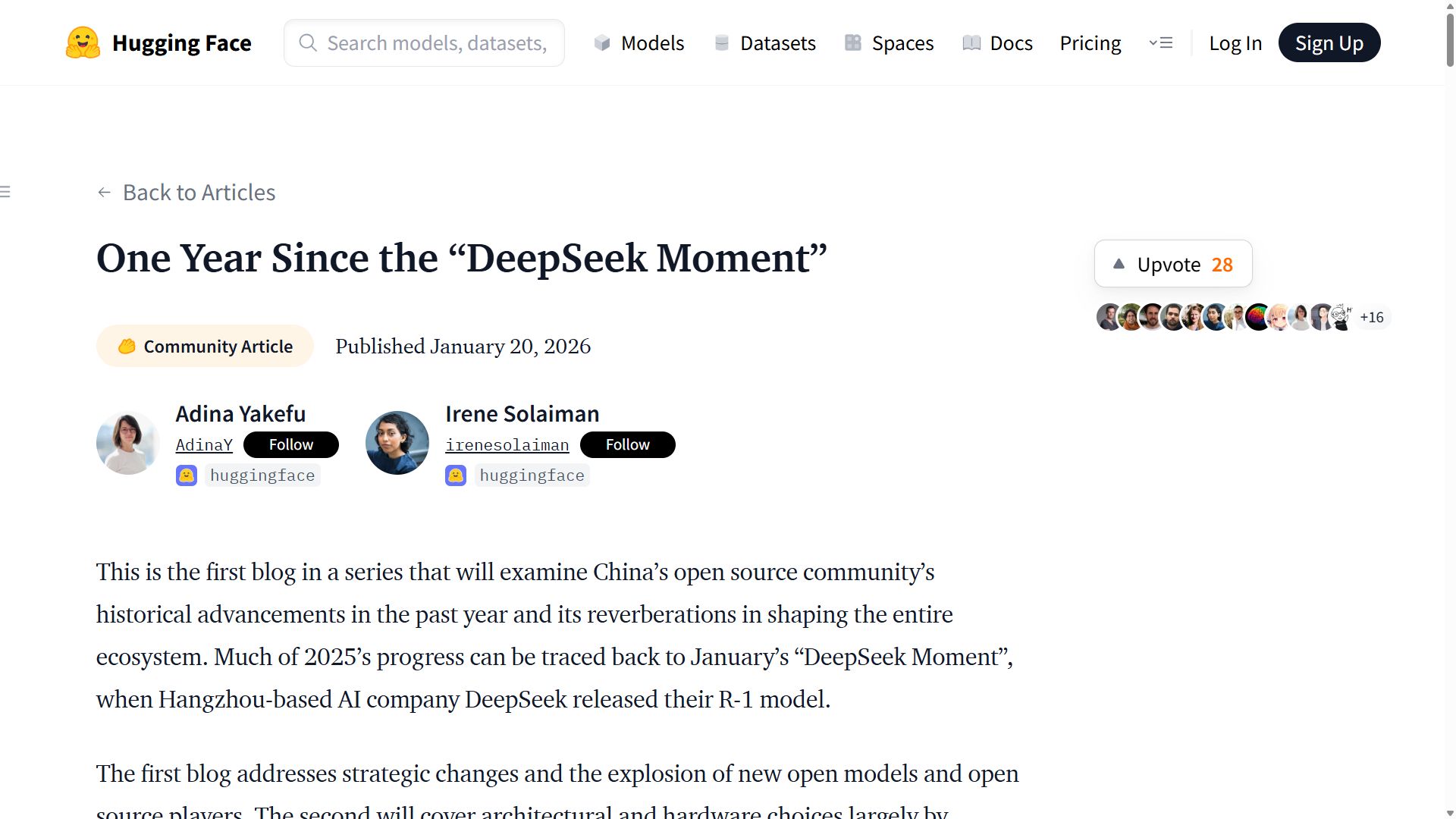 2026年1月20日,全球AI开源中心Hugging Face发布了名为《One Year Since the “DeepSeek Moment”》的一篇社区文章,即回顾“DeepSeek时刻”的一周年,文章无疑是向社区投下了一颗“重磅炸弹”——它并非在宣布某项技术突破,而是冷静地指出了一个已成事实的格局性转变:过去一年全球开源AI生态的激荡与重组,均可追溯至2025年1月中国公司深度求索(DeepSeek)开源R-1模型的那个关键节点,这个被官方称为 “DeepSeek时刻” 的事件,其意义远超越了一款优秀模型的发布,它像一道裂痕,打破了旧有的技术流动与权力平衡,预示着一个由多元化生态驱动、竞争规则被彻底改写的新时代已然降临。