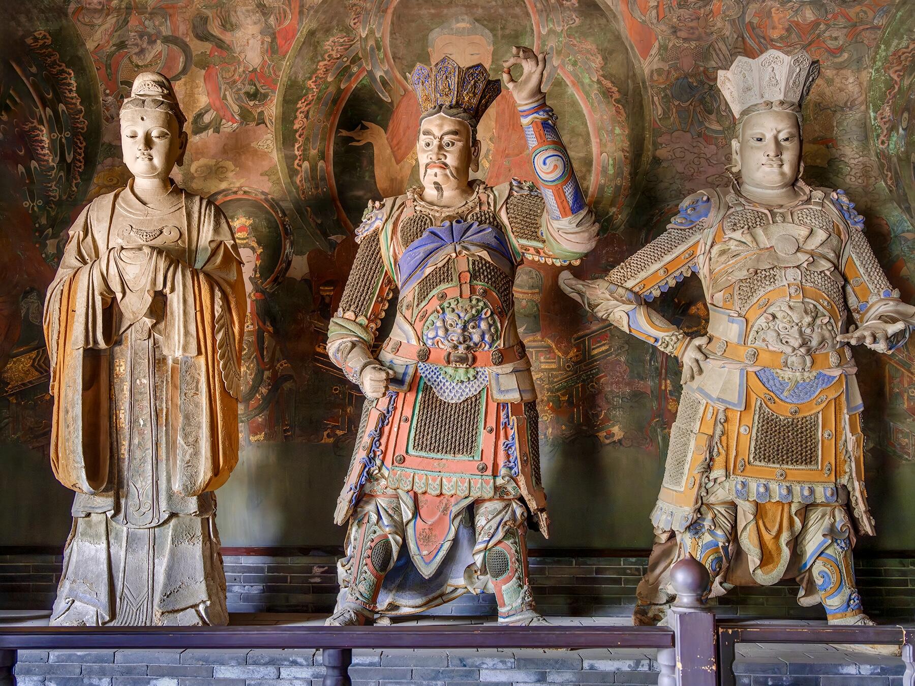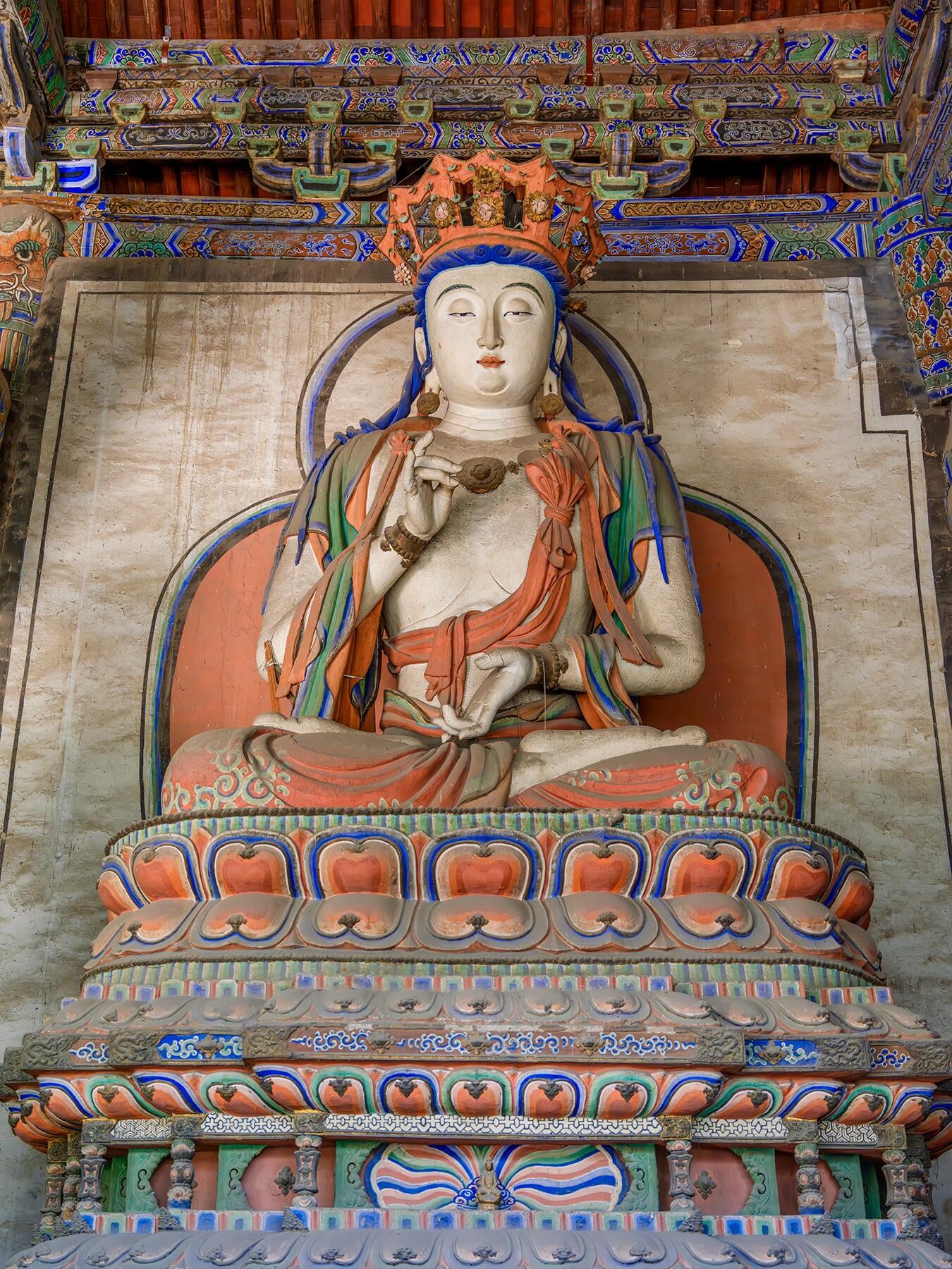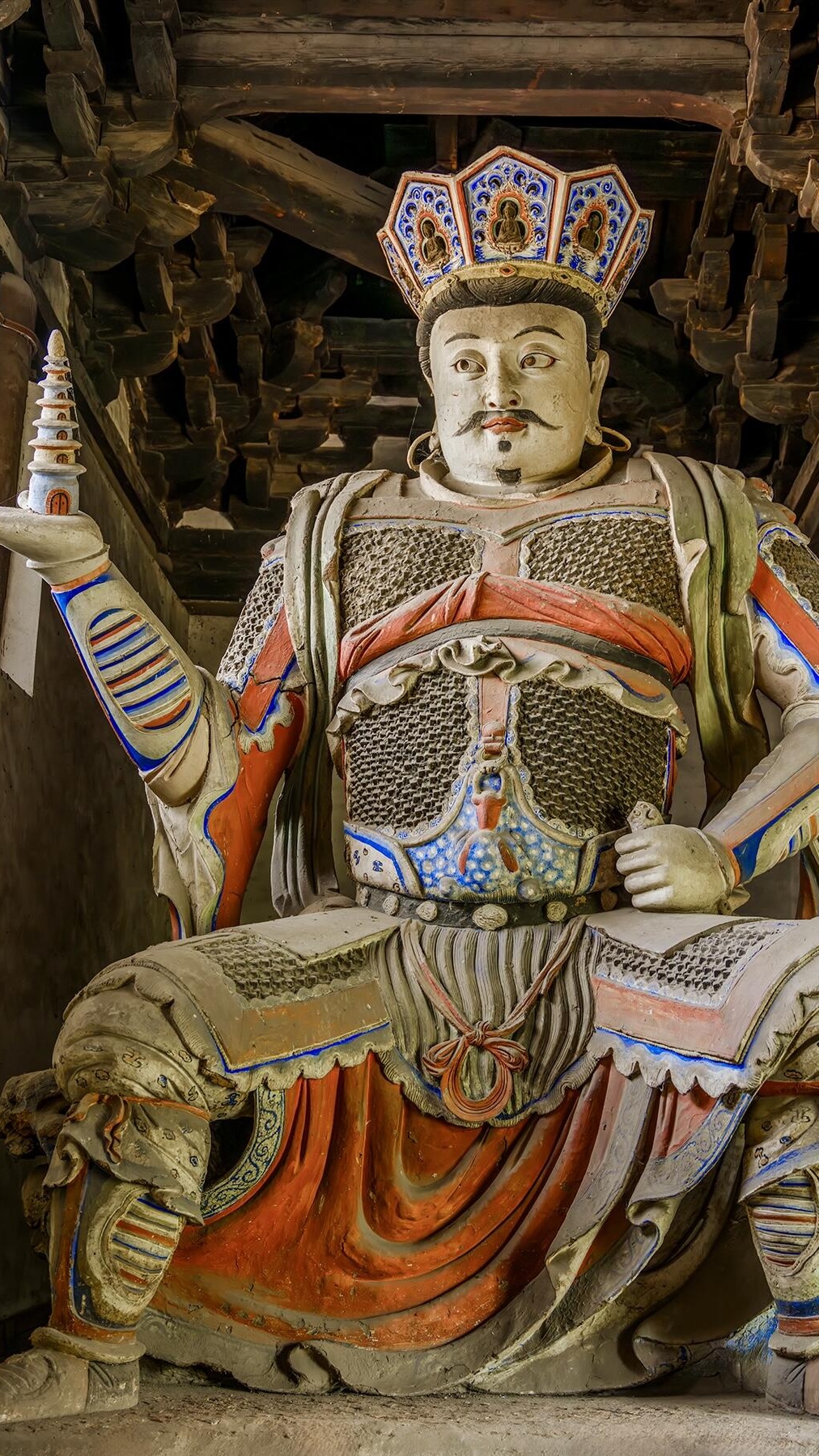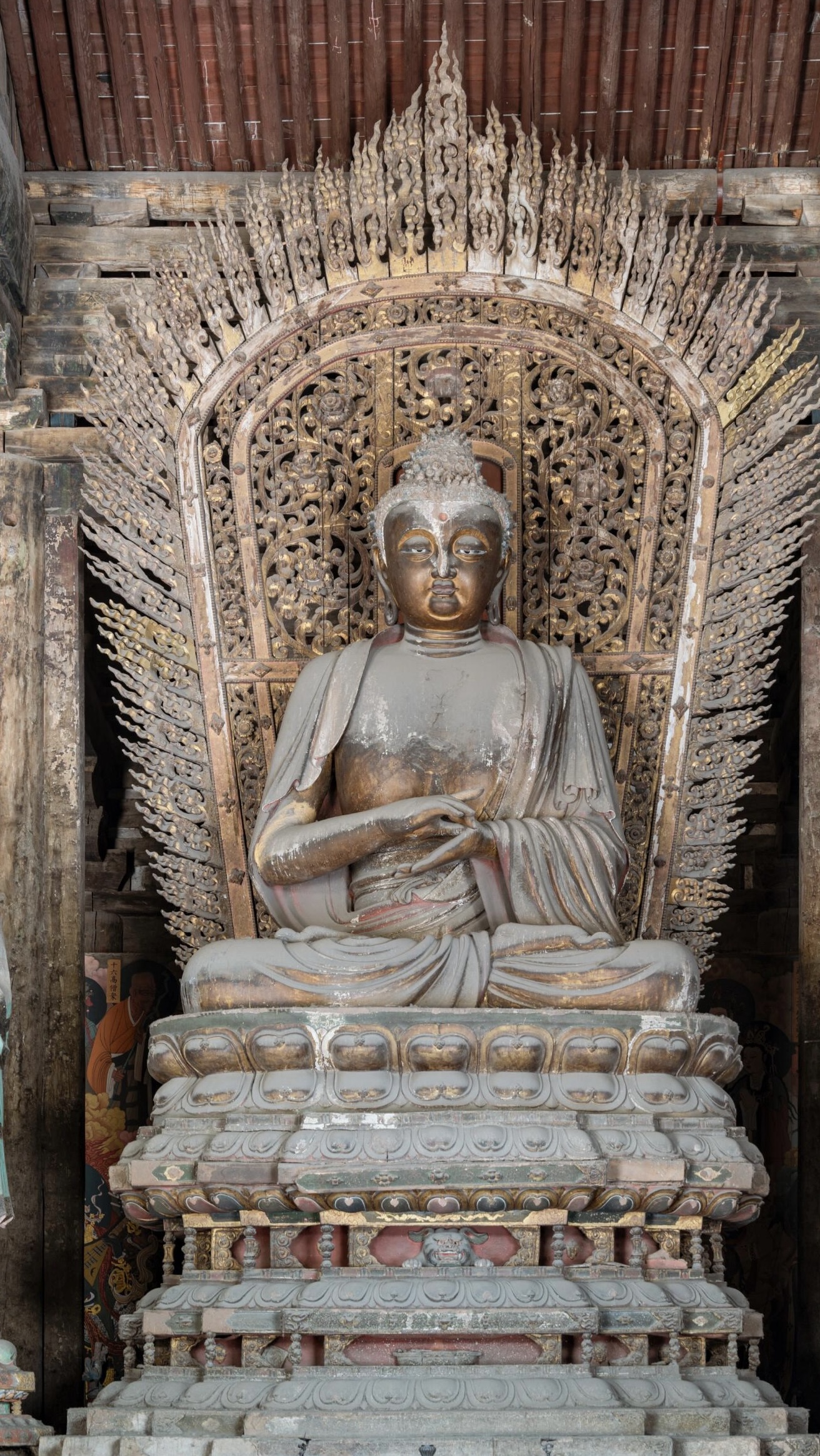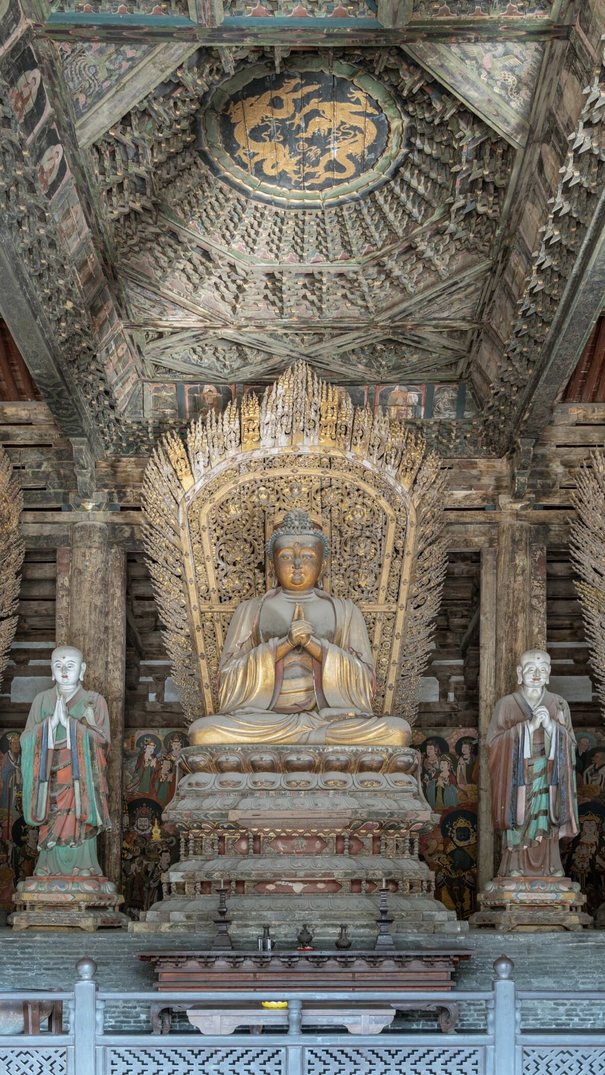 穿过三圣殿,大雄宝殿以一种震慑人心的气势矗立眼前。这座辽代原构的大殿,面阔七间、进深五间,是国内现存最大的辽代佛殿之一。单檐庑殿顶的建筑形式,配以雄浑的斗拱与深远的出檐,展现出辽代建筑特有的豪迈气质。走进殿内,34尊金代彩塑分列佛坛之上,主尊五方佛结跏趺坐,神态庄严;两侧弟子、菩萨身姿优美,衣纹流畅。这些塑像历经八百年岁月,依然色彩鲜艳,造型生动,每一尊都是不可多得的艺术珍品。