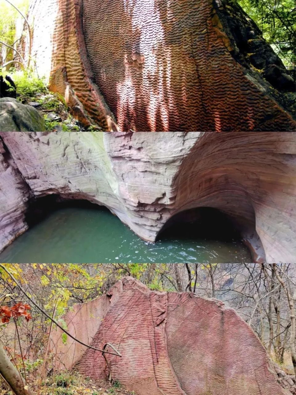 这是一座12亿年前的海洋日记,岩壁上清晰可见的远古海洋生物痕迹!每一层波纹代表不同地质时期的水流或风力作用痕迹,如同大地书写的“年轮”,被联合国专家赞为“天然波痕博物馆”,很有历史意义。