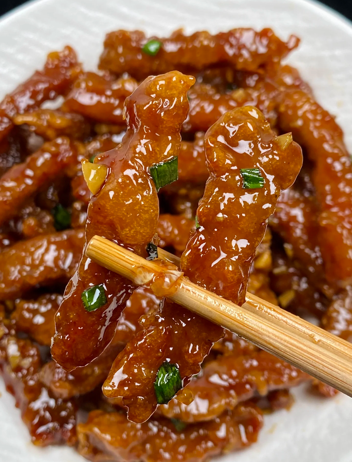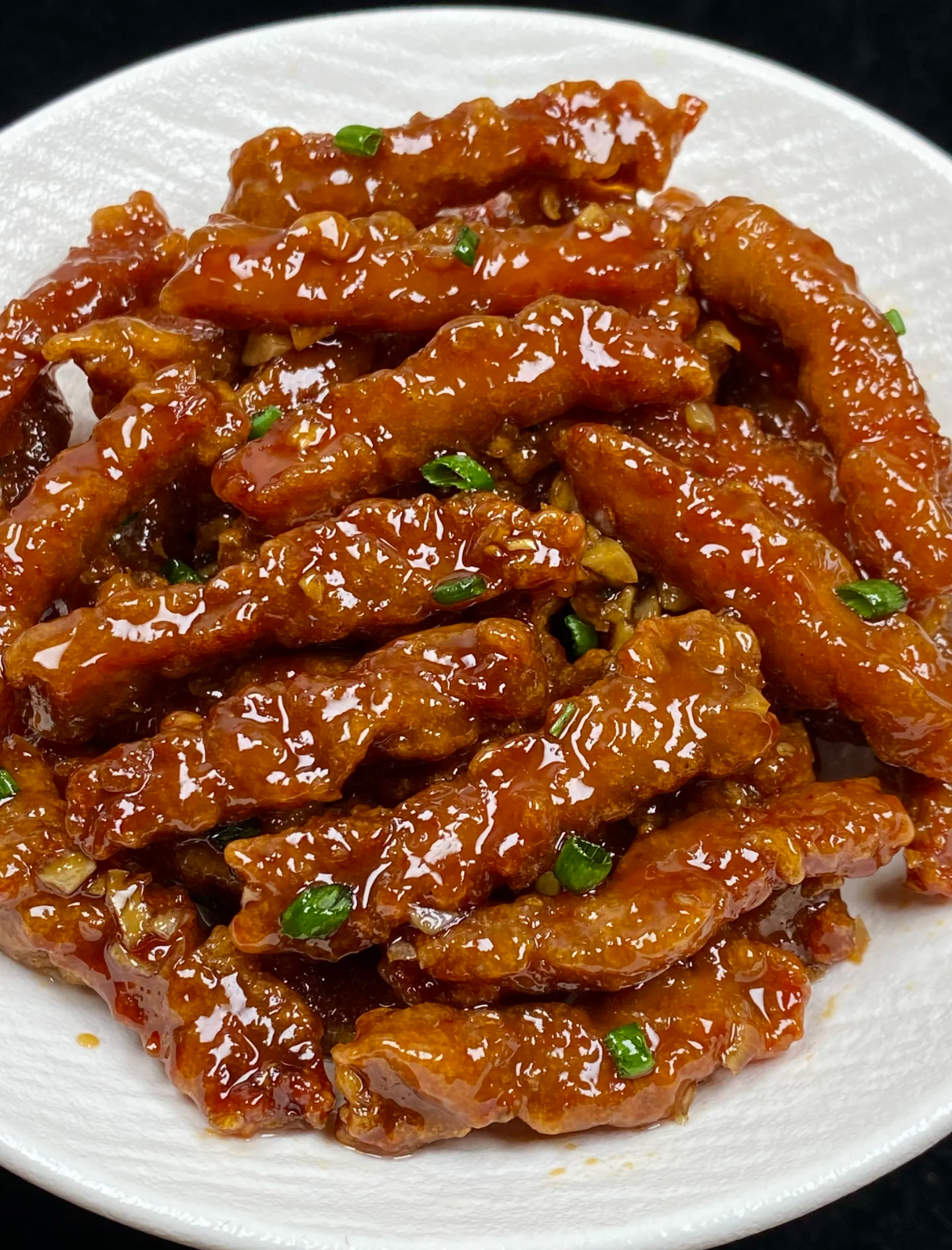 最后一步,炒汁。别洗锅,留一点点底油,蒜末爆香,倒入调好的糖醋汁,中火搅到冒大泡,像小鱼吐泡那样密集,勾半勺水淀粉,汤汁瞬间变晶莹,咕嘟到能挂勺,立刻把炸好的里脊倒进去,关火,掂两下,让每条肉都裹上亮晶晶的糖醋铠甲。撒一把熟白芝麻,翠绿葱花一点,红亮亮、香喷喷,端上桌就是C位。