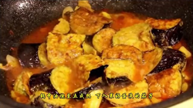 3. 锅中油烧至五成热,下入裹好蛋液的茄子,全程中小火慢炸,炸至茄子表面金黄捞出控油。