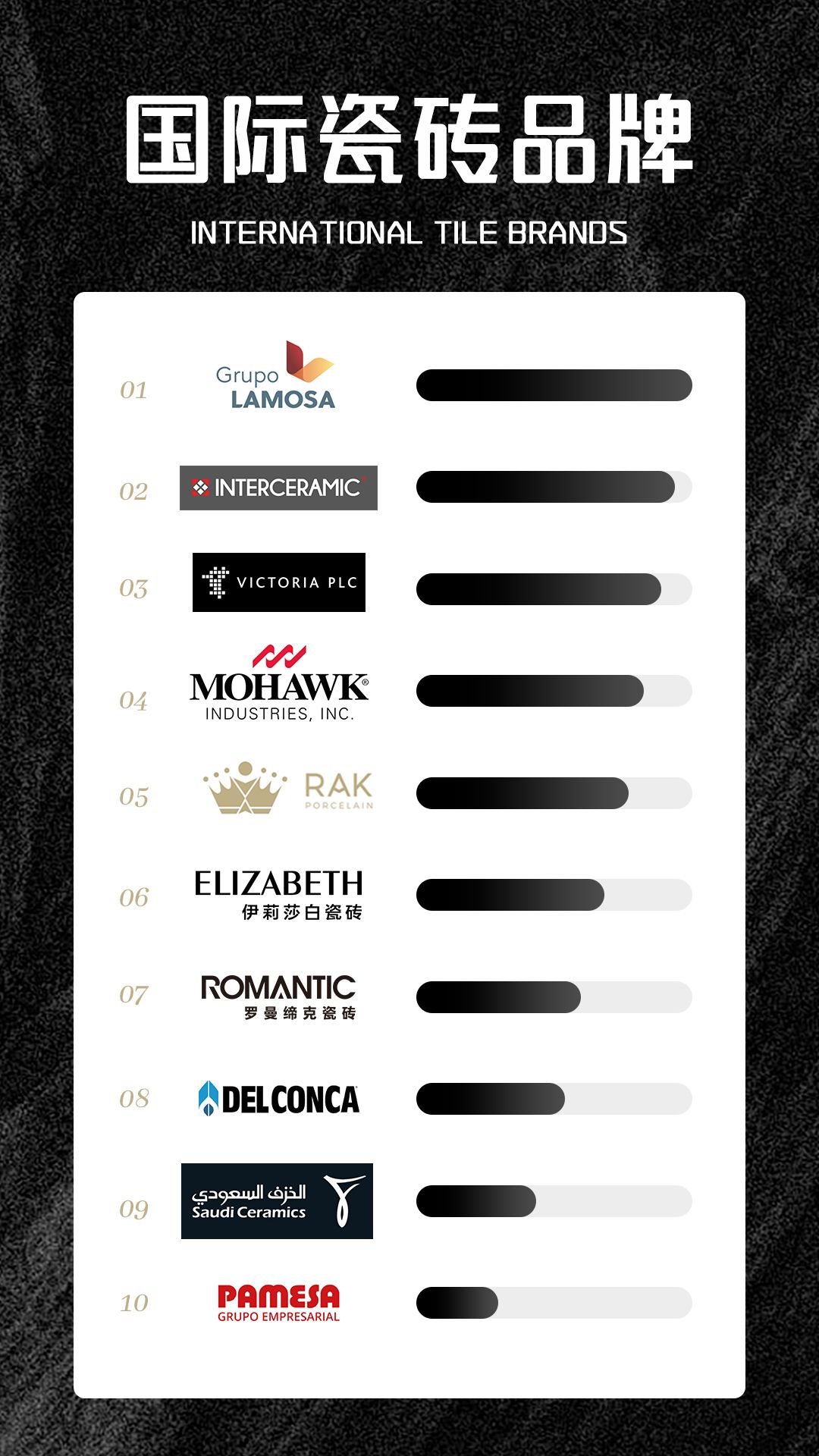 莫和克工业(Mohawk Industries):是一家美国企业。它是世界上最大的瓷砖和天然石材制造商、分销商和营销商2。旗下拥有 Mohawk、Karastan、Godfrey Hirst 等多个品牌2。2023 年 6 月,以 117.371 亿美元营收,入选 2023 年《财富》美国 500 强排行榜,排名第 351 位。帕米萨瓷砖(Pamesa):1972 年成立于西班牙,是建筑材料领域的企业,主要从事瓷砖的设计、制造和分销,产品销往 150 多个国家。1987 年,该公司开启了紧凑型瓷质砖的生产,是西班牙此类产品生产的先驱。自 1997 年起,借助设计师阿加莎・鲁伊斯・德拉普拉达(Agatha Ruiz de la Prada)的创造力,推出了先锋陶瓷设计系列。英国维多利亚集团(Victoria PLC)4:总部位于英国伍斯特,是一家创新地板产品的国际制造商和分销商。其业务涵盖地毯、地板衬垫、瓷砖、豪华乙烯基瓷砖(LVT)、人造草和地板配件等。公司在英国、西班牙、意大利等多个国家运营,拥有约 6300 名员工,是欧洲最大的地毯制造商和澳大利亚第二大地毯制造商,同时也是这两个地区最大的衬垫制造商。拉莫萨集团(Grupo Lamosa)5:是世界上最大的陶瓷制造商之一,拥有超过 130 年的历史。业务涉及陶瓷涂层产品和胶粘剂,在墨西哥胶粘剂市场占据主导地位。集团在阿根廷、巴西、哥伦比亚等 9 个国家设有 50 个生产中心,还收购了在欧洲颇具知名度的 Baldocer 等品牌。国际瓷砖品牌罗曼缔克瓷砖(ROMANTIC)7:始创于 2000 年,营销总部位于广东佛山,是佛陶集团旗下的创新型标杆企业,也是集生产、研发、销售于一体的高档建筑装饰材料大型建陶企业。其拥有 2 大智能生产基地,8 条绿色智能生产线,产品涵盖岩板、大理石瓷砖、现代木纹砖等多个系列,是 “特色瓷砖领导品牌”。康卡集团(Gruppo Concorde):1969年,康卡集团在意大利博洛尼亚成立。凭借其创新的设计和高品质的产品,它在建筑和装饰领域占据了重要地位。国际瓷砖品牌伊莉莎白瓷砖(ELIZABETH)6:注重产品的创新研发与配套设计,以大自然为创意来源,打造出多款逼真细腻的瓷砖产品。如 “卡里姆灰” 系列瓷砖,通过不同尺寸,满足了卫生间、办公楼等不同空间的应用需求,展现出沉稳大气或时尚的风格。ICC 陶瓷(Interceramic China)11:由北美最大的陶瓷生产运营商 Interceramic 投资成立,传承了 Interceramic 三十多年的国际经验。依托 Interceramic 旗下 25 家研发中心和 9 大生产基地,拥有世界一流的设备工艺和研发体系,其研发理念领先,融汇欧美设计精髓,引领国际流行设计趋势。RAK 陶瓷(RAK Ceramics)10:1989 年成立,总部位于阿联酋,是世界上最大的陶瓷品牌之一。专业生产陶瓷、炻瓷、墙地砖和卫生陶瓷等产品,在阿联酋、印度、孟加拉国和欧洲拥有 23 家现代化工厂,每年可生产 1.18 亿平方米瓷砖、570 万件卫生陶瓷等。产品销往全球 150 多个国家,员工约 12000 人,在阿布扎比证券交易所和达卡证券交易所上市。沙特陶瓷公司(Saudi Ceramics):1977年,沙特陶瓷公司在沙特阿拉伯成立。作为该国最大的建筑材料制造商之一,它以高品质的产品和创新的理念在国内外市场上赢得了良好的声誉。上述十家企业横跨欧美、中东及中国等多个核心市场,共同勾勒出全球陶瓷及地板建材行业的多元图景。从美国莫和克工业的全球龙头地位,到西班牙帕米萨瓷砖的设计先锋精神;从阿联酋 RAK 陶瓷的跨国生产布局,到中国罗曼缔克瓷砖等品牌的本土创新突破,各家企业凭借独特的历史积淀、技术优势与市场策略,在行业中占据了重要席位。它们不仅推动着瓷砖产品在材质、设计与环保性能上的持续升级,更通过全球化的生产与分销网络,连接起不同地区的建筑装饰需求。未来,随着绿色制造理念的深化、消费审美的迭代以及国际市场的动态调整,这些企业或将在技术研发、品牌深耕与跨界融合中继续突破,为全球建材行业的创新发展注入源源不断的动力。