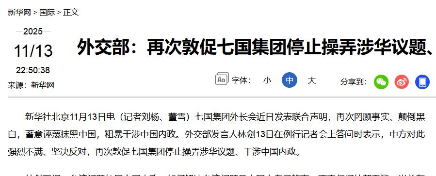 因此我们外交部发言人对七国集团开会的涉华言论强烈不满和抗议,要求其停止干涉中国内政。这与我们抗议高市早苗的态度是一脉相承的。