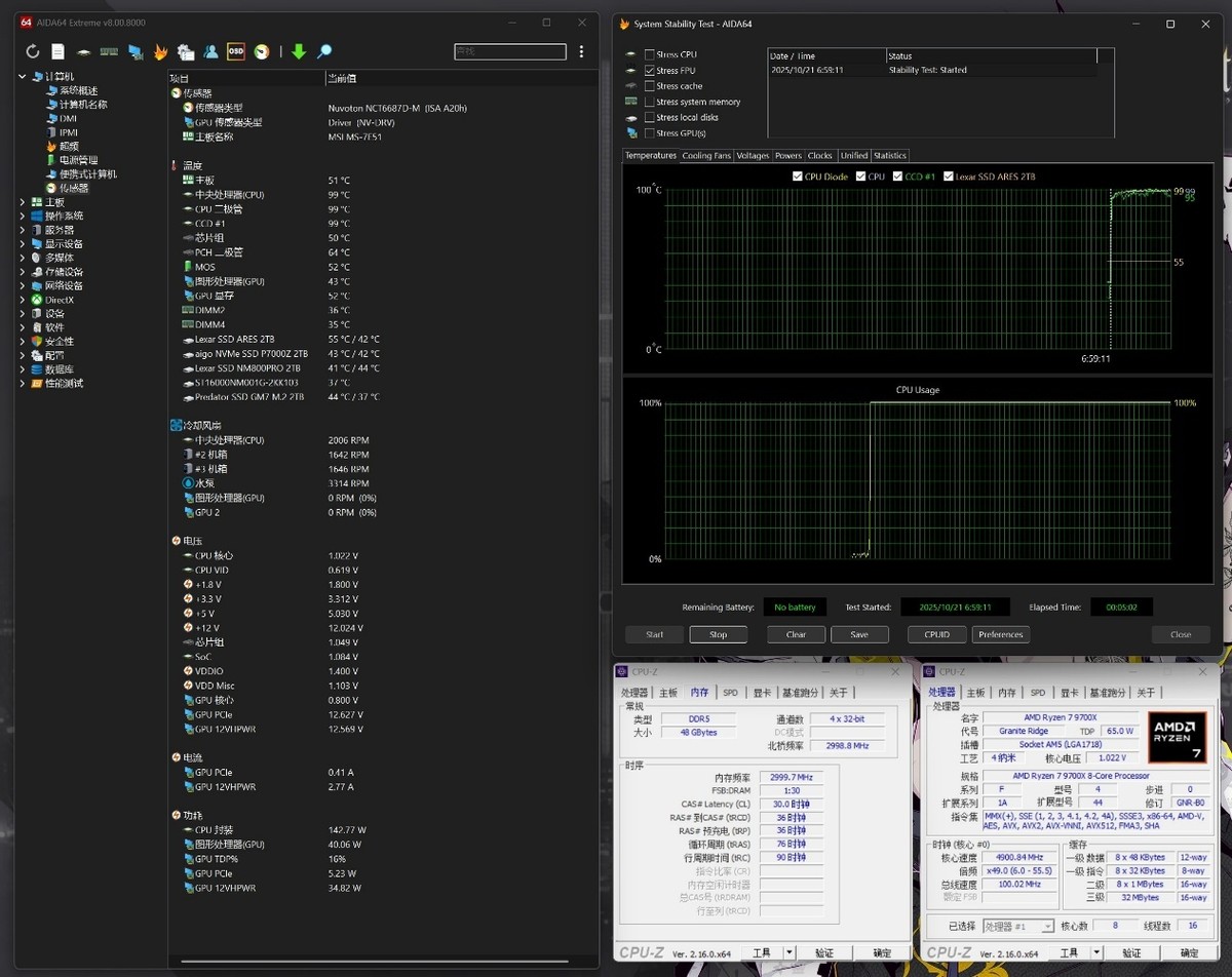 经过来回加压折腾数次,尽管9700X全核4.9GHz的积热问题巨大,但最终还是把温度稳定在99~101度,此时CPU package功耗读数进一步提升至140~150W,可以说相当恐怖;恐怕再打算提升频率的话,扬程更高和冷排更多的分体水冷套件是跑不掉的了。