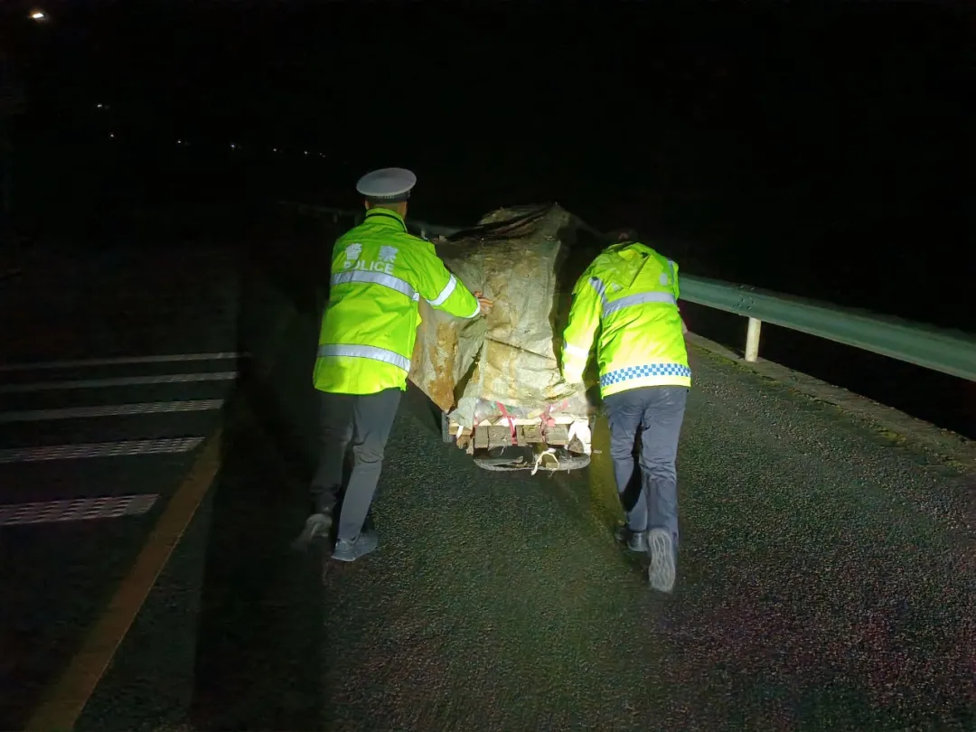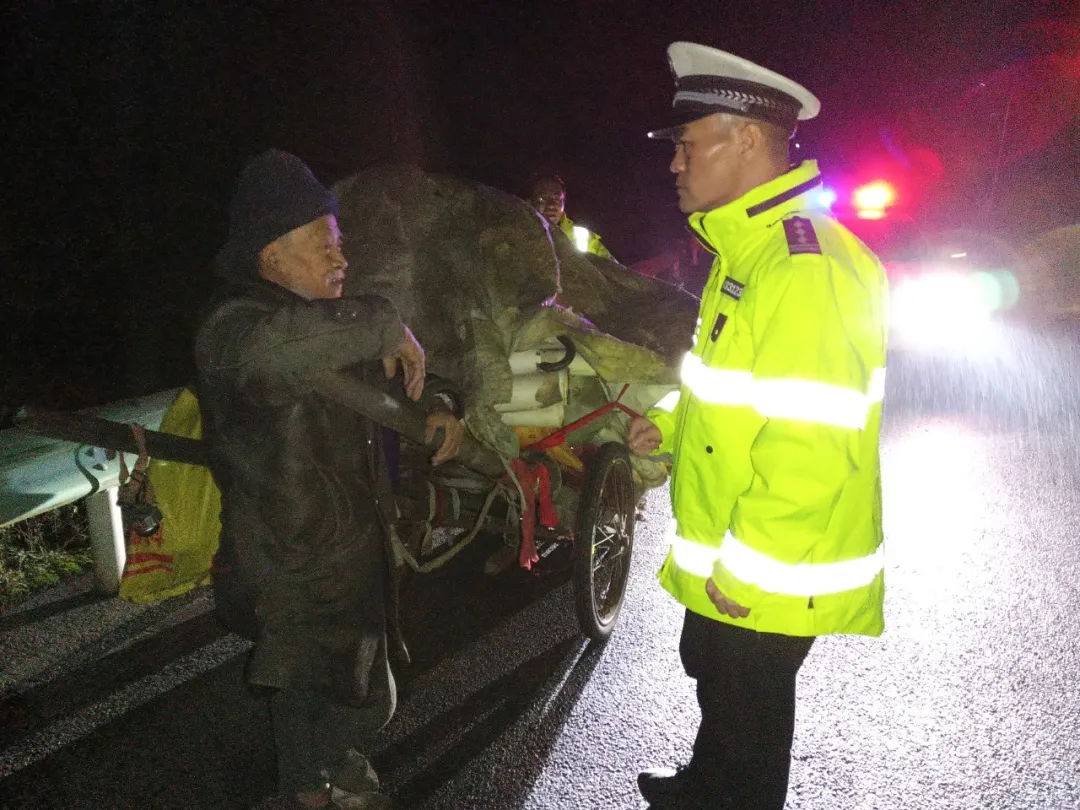 2026年1月2日22时25分许,大队领导胡小镝同志带队开展夜间巡查,行至小峰坎路段时,发现一名老人正吃力地推着满载货物的板车前行。彼时天空飘着小雨,该路段又是长上坡,湿滑的路面让老人推车愈发艰难。胡小镝同志考虑到雨夜路况差、视线模糊,极易引发交通事故,当即与同行值班人员下车,主动帮老人推车至安全路段。随后,胡小镝同志向老人细致叮嘱交通安全注意事项:雨夜出行务必穿戴反光标识衣物,尽量避开坡道、弯道等危险路段;出行尽量选择白天或天气良好时段,切实增强自我保护意识,暖心举动与安全提示,让老人倍感温暖。