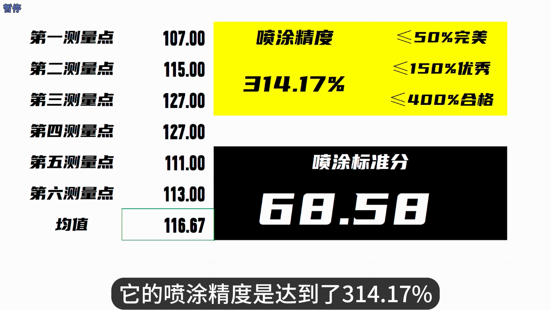 测量完了钣金工艺之后就是喷涂工艺测试,我们会在引擎盖这块全车最大,同时也是冲压形面最复杂的钣金面上选择6个点,并测量这6个点的漆膜厚度,通过计算这6个点的测量数值,就能计算出其喷涂精度。