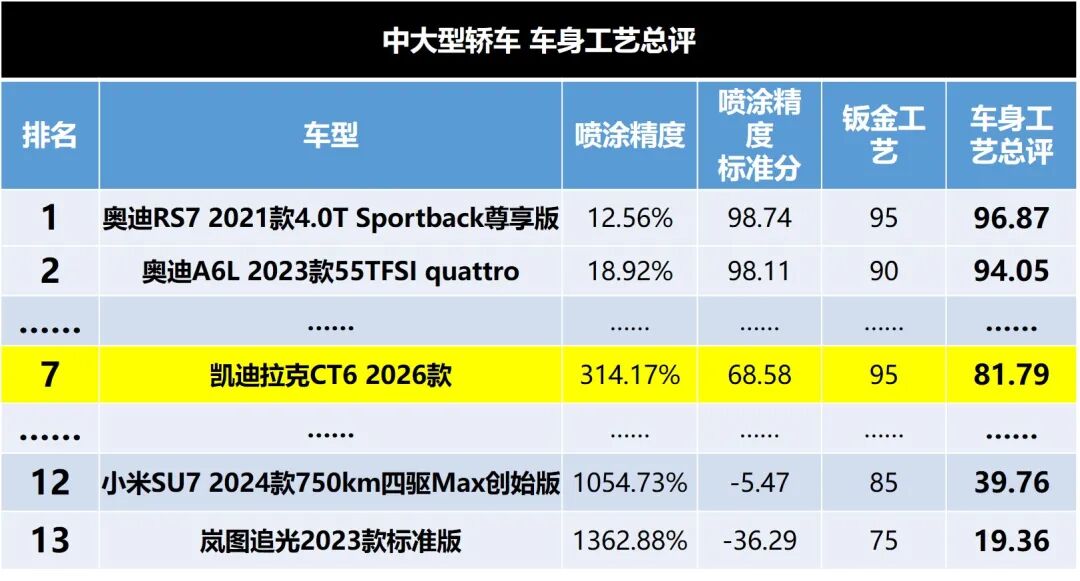 6个测量点的喷涂精度计算下来是314.17%,折算成标准分是68.58分。综合下来,凯迪拉克新CT6车身工艺总评得到了81.79分,在我们测试过的中大型轿车当中暂时排名第7,属于中游水平。
