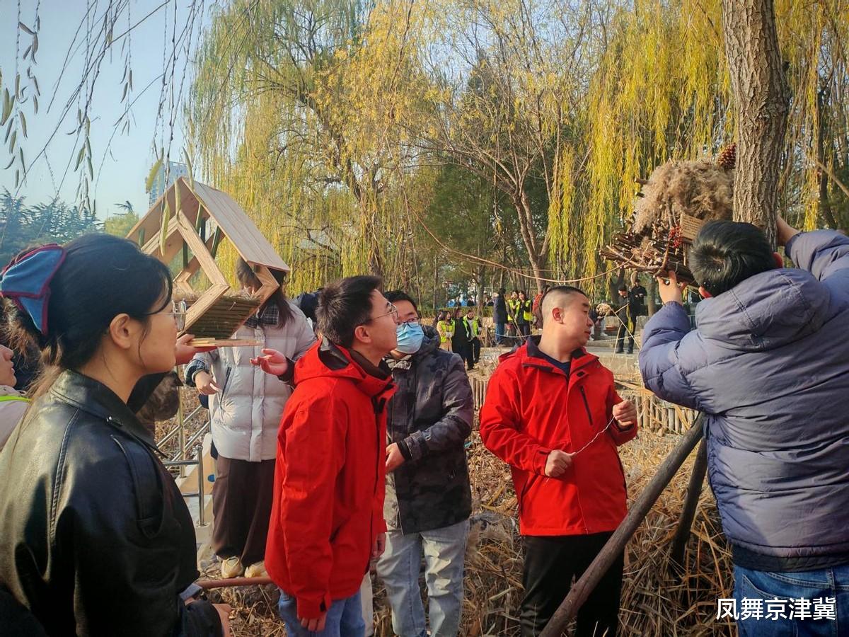 活动中,河北工艺美术职业学院时尚工艺系师生志愿者充分发挥专业优势,结合竞秀公园野生鸟类生活环境,事先精心设计并制作了多款生态环保、适配越冬的鸟窝。在市民园长、志愿者与竞秀公园工作人员密切配合下,将15个鸟窝有序安置在公园树木、芦苇丛及湖心岛等隐蔽区域,为黑水鸡等鸟类打造了温暖安全的越冬“居所”。公园多名职工全程参与安装布置,同步提供现场技术指导与安全保障,确保活动高效有序推进。