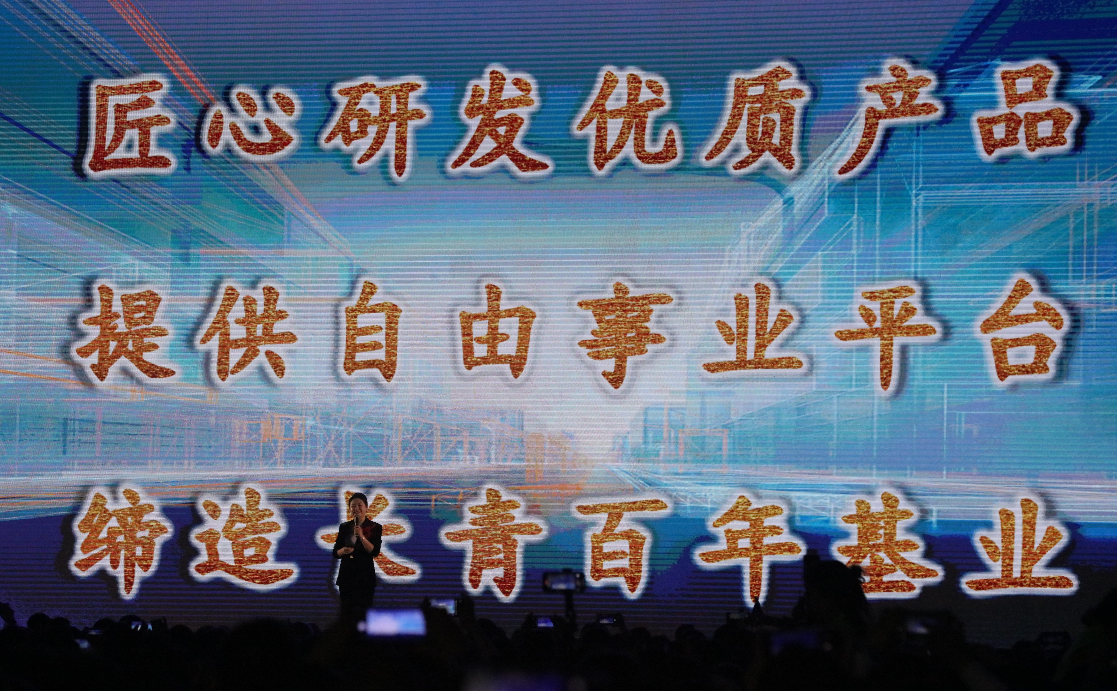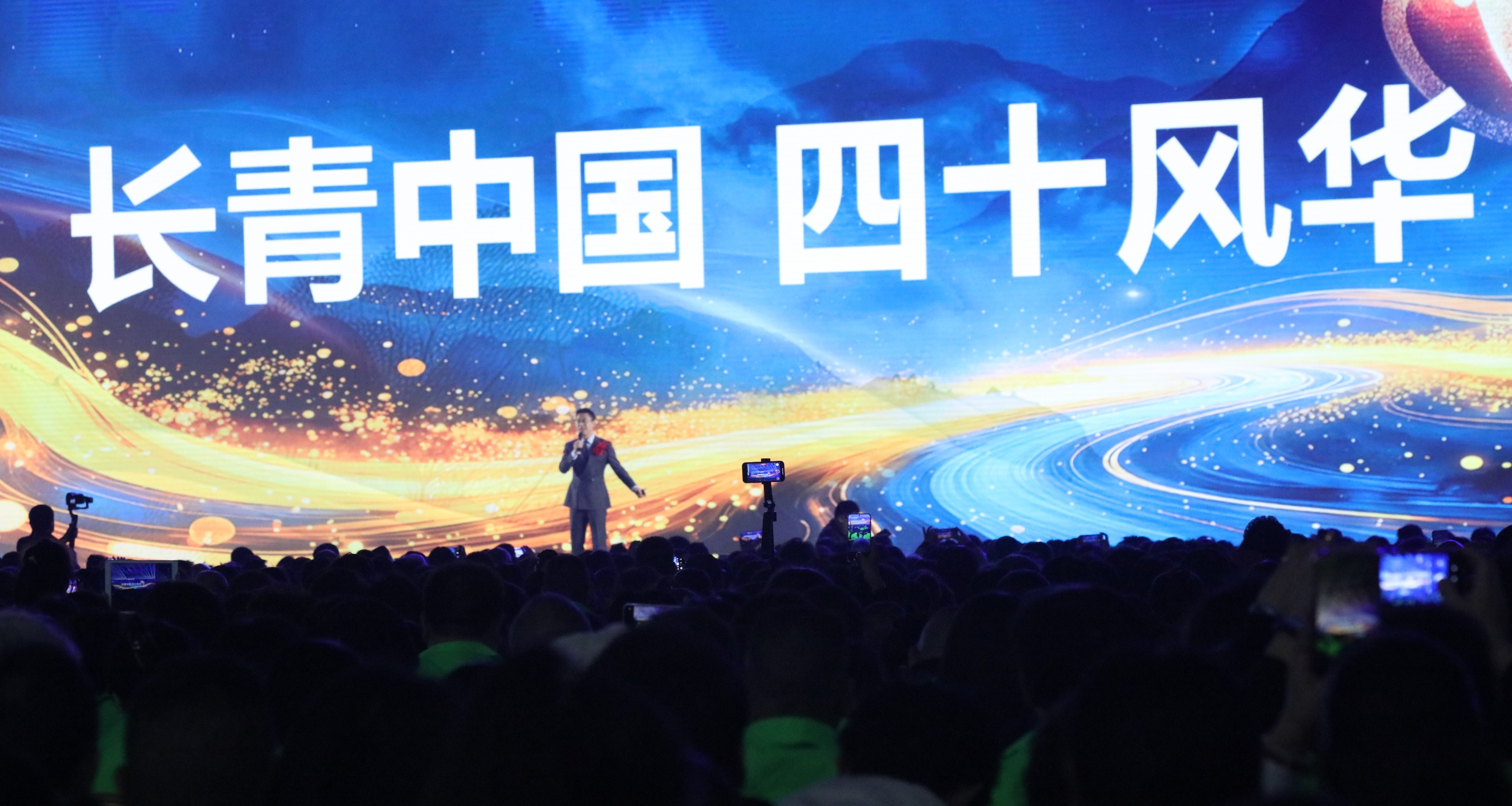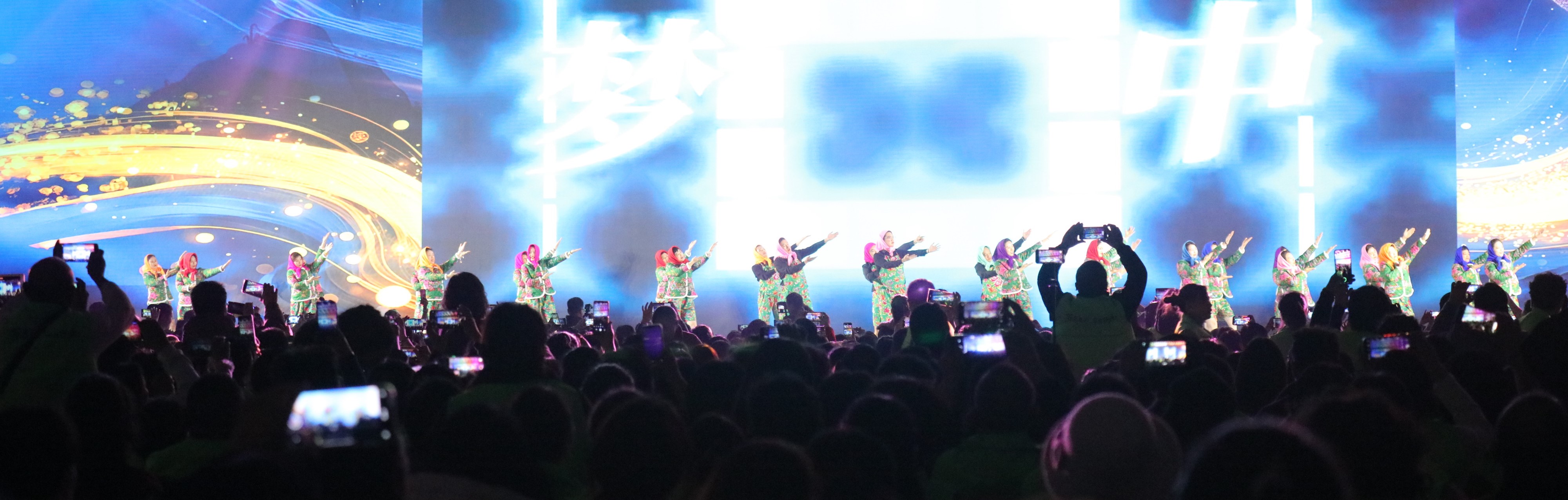 旗帜飞扬,光影交错。一场气势恢宏的开场灯光秀,勾勒出长青人一路走来的铿锵足迹。集体表演《万众一心》以磅礴之势点燃全场,瞬间凝结起情感的共鸣。随之播放的公司视频,则以一幕幕动人画面,重现四十年品牌成长的岁月留痕,令人心潮澎湃,自豪涌动。