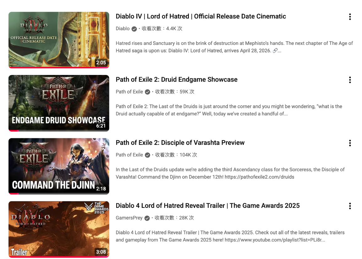 《暗黑破坏神4》官方率先发布宣传片,虽然占据了先发优势,但其在老鼠台的同期观看热度与玩家讨论度,却显著低于《流放之路2》展示新职业“德鲁伊”及其“萨满”“先知”两大升华体系的实机内容。
