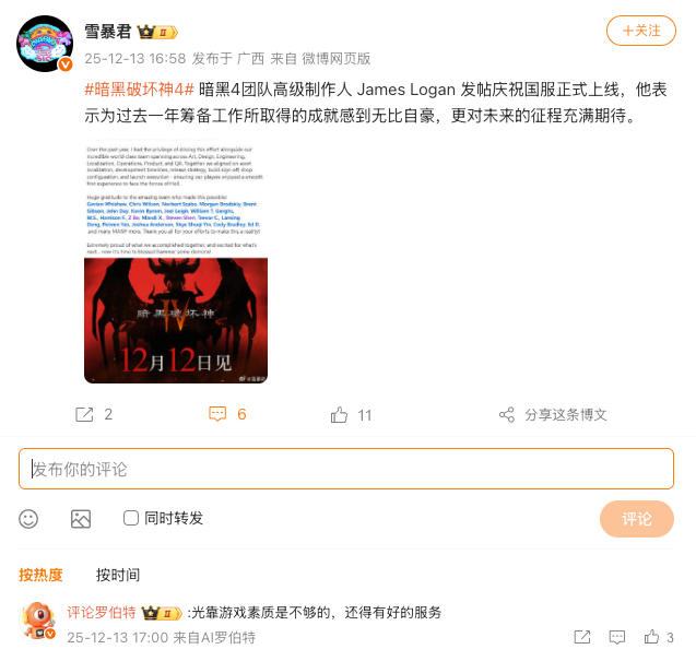 平心而论,本次两款游戏口碑差异的核心,在于双方为玩家准备的“诚意套餐”份量悬殊。以《暗黑破坏神4》为例,自开服以来,其职业平衡问题、后期玩法重复等争议始终不断。此次资料片版本的预告,除了复刻二代的“新”职业圣骑士外,也未能拿出足以扭转局面的实质性更新,被老玩家批评为“换汤不换药”。就连微博罗伯特也在相关新闻的评论区发起吐槽,认为想要积极赚钱没问题,但网易和暴雪似乎少了一些服务精神,引得玩家们纷纷表示:“最支持的一集!”