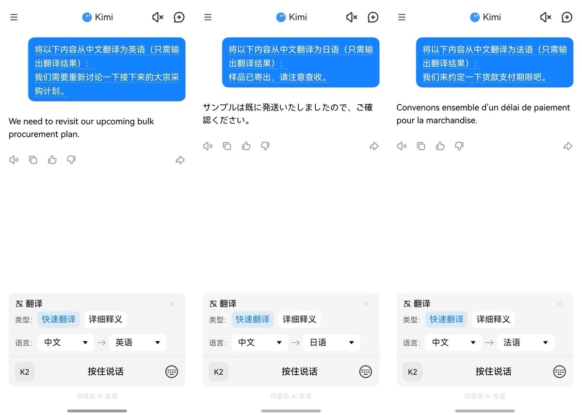 最后还有Kimi卡片,刚装上时我以为就是个普通的快捷方式。用了两周才发现,它其实是"职场外挂"。因为我所在的公司涉及外贸业务,偶尔需要我接待外国客户,这时候Kimi的翻译功能就起了很大作用,不管是接待英语、日语还是法语用户,我们都能靠它顺畅地交流,这成单率高有一半是它的功劳。另外偶尔帮我查找一些背景材料,解释专有名词等也是“基操”,工作效率一下就上来了。