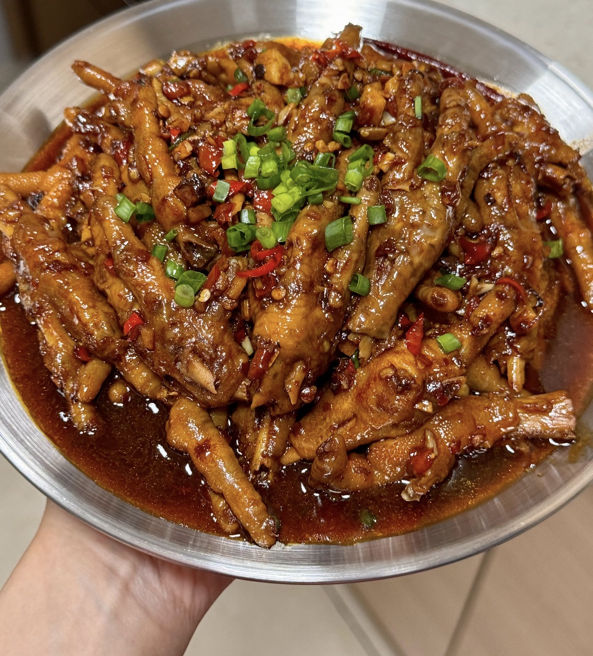 这时,倒入足以没过所有鸡爪的开水。记住,一定是开水,冷水会让鸡皮骤然收缩,影响软糯的口感。加入少许盐和胡椒粉调味,大火烧开后,转为小火,盖上锅盖,慢悠悠地焖煮。剩下的,就交给时间。约莫四十分钟到一小时,汤汁会收得浓稠,鸡爪也到了最完美的状态——用筷子轻轻一戳,皮肉便轻易分离,却又不会完全散架,保留着一丝啃食的乐趣。最后,可以开大火将汤汁收到粘稠,牢牢地包裹住每一只鸡爪,撒上一把白芝麻和葱花,即可出锅。
