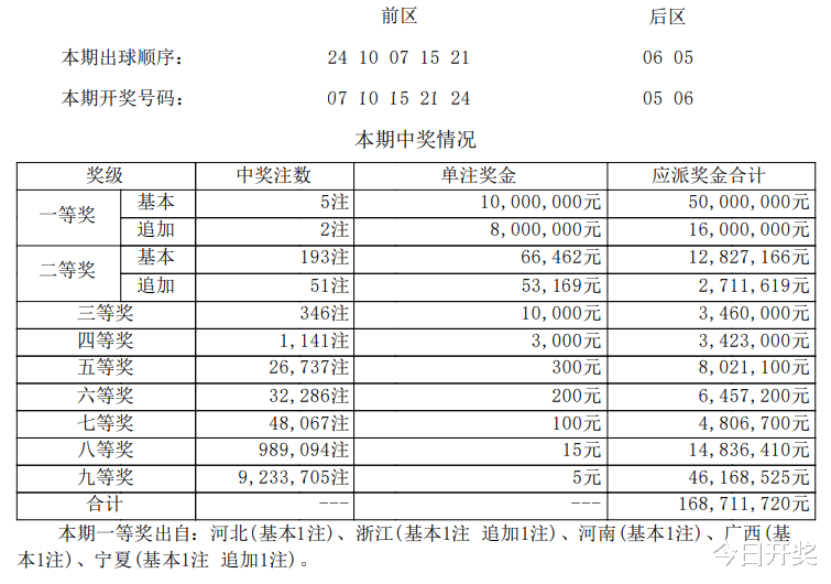 本期为大乐透的第25078期开奖,本期全国销售金额:322,049,886元,本期使用第1套摇奖球,本期出球顺序: 24 10 07 15 21+ 06 05,本期开奖号码: 07 10 15 21 24 +05 06,本期的大乐透前区还是三无号码了,也就是无连号,无同尾数号码,无掉号,这已经是连续五期了,估计出乎很多彩民的意料之外了,不过间隔三期跟间隔五期出现的号码都是两个,间隔三期的是15跟21,间隔五期的号码是07跟24,后区的倒是开出了一组连号,而且其中的05也是间隔三期之后出来的,那么开出这样的号码组合全国彩民中奖情况如何了?