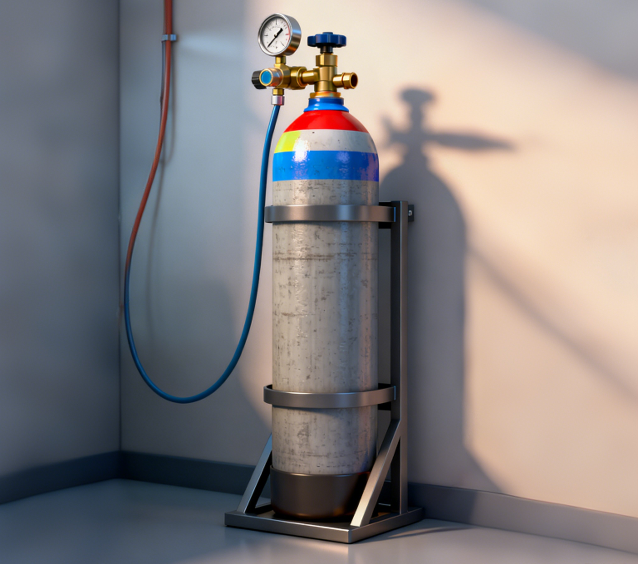 固定存放:气瓶需垂直放置在专用气瓶架上,用铁链或绷带固定(固定位置为瓶体中上部,松紧度以手推瓶体无晃动为宜),严禁卧放(卧放可能导致瓶阀受力不均,或瓶内少量冷凝水进入阀口造成堵塞)。