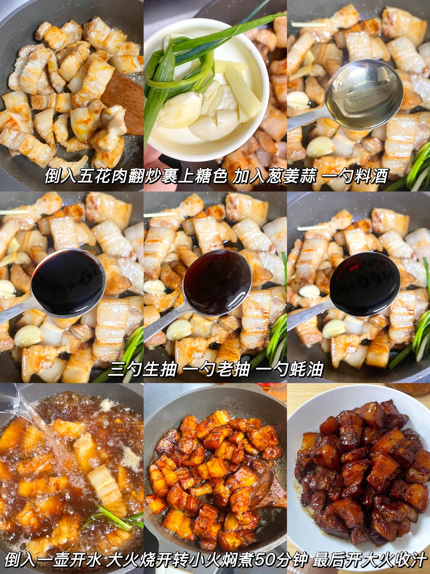 五花肉 500g、冰糖 30g、葱姜、八角、桂皮、香叶、生抽、老抽、料酒/黄酒。