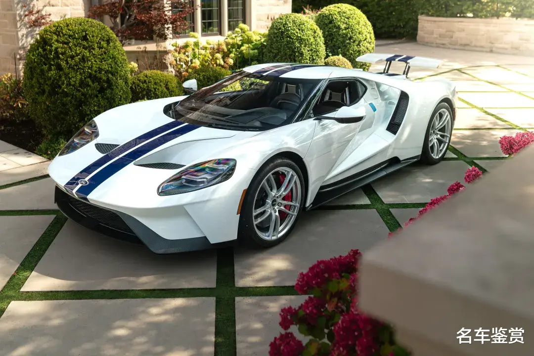 这辆2018款福特GT采用冰冻白车身搭配超声波蓝珍珠金属条纹。其他选配还包括六点式安全带、外观哑光碳纤维套件、皮革包裹方向盘、红色制动卡钳、20英寸缎面银色合金轮毂和Akrapovič钛合金排气系统。其他细节包括LED前大灯、轻量化Gorilla Glass挡风玻璃、蝴蝶门、可伸缩主动式后扰流板、LED尾灯和后扩散器。