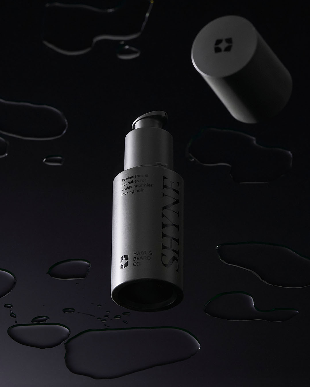 光影效果的巧妙运用是SHYNE包装的一大亮点。在黑色背景的衬托下,瓶身的立体感被无限放大,光影的交错仿佛在诉说着品质与内涵。这种设计风格精准地捕捉到了男性消费者对于简约、实用且高品质的追求,无需花哨的修饰,仅凭纯粹的设计语言便能展现出强大的气场与专业的形象。