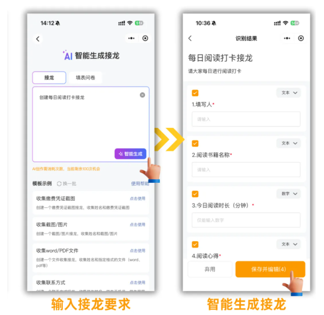 30秒创建:输入“创建一条每日阅读打卡接龙”,AI自动生成包含姓名、阅读书籍名称、阅读时长、阅读感悟、阅读照片等内容在内的接龙,转发到班级群学生即可参与。