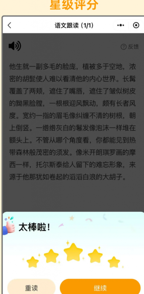 AI系统辅助学生朗读+背诵,从发音准确度、流利度、完整度等多维度智能评分。