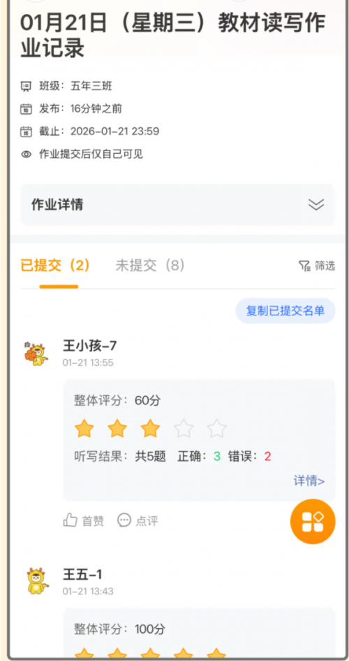 提交听写后,AI自动批改,老师轻松查看听写结果,哪些字词错得多,进行针对性辅导,教学效率大大提升。