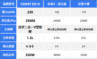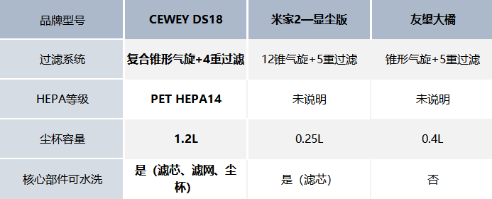 小结:从数据上看,CEWEY DS18 的表现可以说很突出 —— 过滤系统和 HEPA 等级综合起来最出色,1.2L 的超大尘杯更是比其他两款大好几倍,能大大减少倒垃圾的频率;核心部件支持水洗这一点,也保证了长期使用的卫生。米家2 与友望大橘 虽然也有多层过滤,但要么滤网等级不高,要么没把等级说清楚;尘杯容积都不足 0.6L,还有些组件不能水洗,所以在清洁体验和使用便利性上,就会稍显逊色。