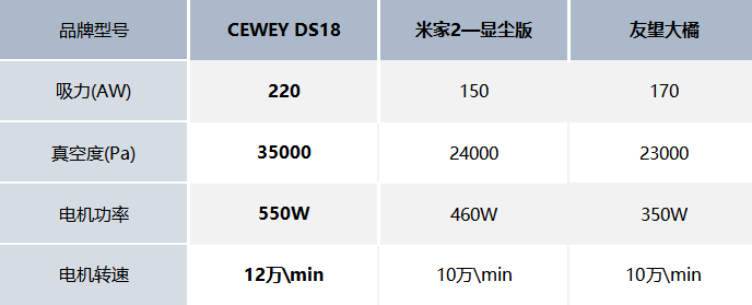 小结:从核心性能参数来看,CEWEY DS18 吸尘器的综合实力是三款里最突出的。不管是吸力强度、输出稳定性,还是气流效率,都做到了均衡优化。放在同价位里说,它算是性能发挥得最到位、清洁力表现最亮眼的一款了。至于友望大橘,整体参数就稍微弱一点,吸力值在三款里是最低的。平时日常用倒没什么问题,但碰到复杂清洁场景,动力就有点跟不上了。而米家2,虽然吸力比 CEWEY 稍低些,但日常擦地板清洁时发挥挺稳定的,更适合家里灰尘不多的朋友。