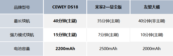 聊到续航参数,重点得比一比三款吸尘器在标准模式和强力续航模式下的持续时间,同时把电池容量直观对比一下。测试数据汇总: