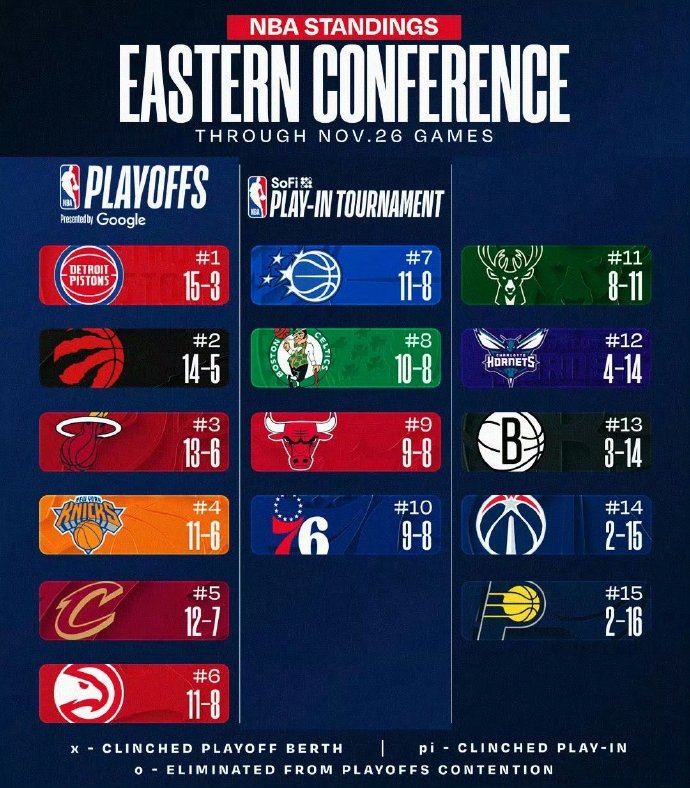 凯尔特人和雄鹿这两支本来应该是强队的东部球队,阵容实力本来也不错,但受到伤病影响,战绩也不是很好。绿军目前是10胜8负,而雄鹿只有8胜11负。76人和公牛本赛季开局都很亮眼,但目前战绩都下滑了,目前都是9胜8负。