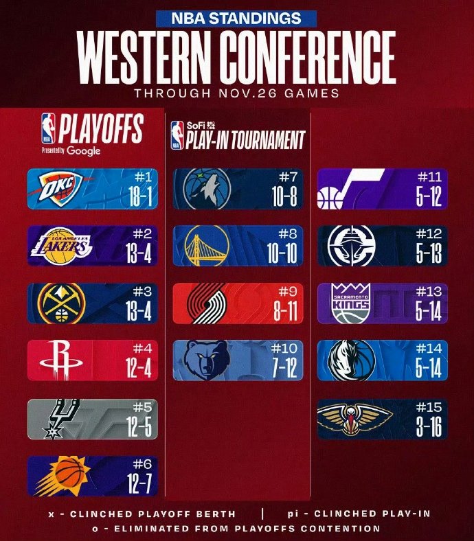 太阳本赛季至今的表现也很亮眼,在拆散了三巨头之后,依旧打出了12胜7负的战绩,排在西部前六,而且还是在杰伦-格林只打了一场的情况下。森林狼表现中规中矩,以10胜8负暂时排在西部第七。而勇士战绩为10胜10负,暂时排在西部第八。开拓者目以8胜11负排在西部第九,和上赛季相比也有一定进步。灰熊战绩为7胜12负,表现不及预期。