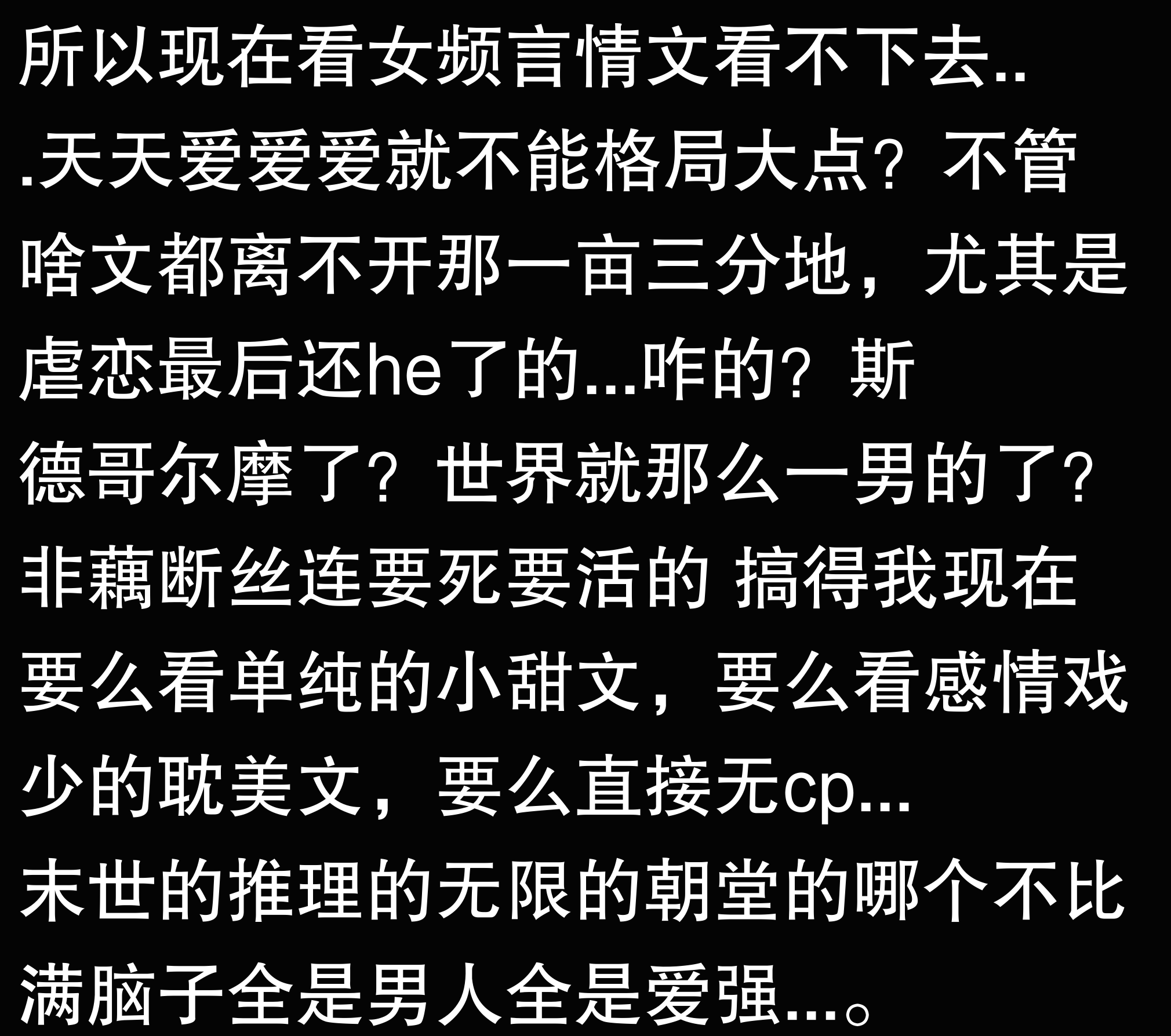 不看女尊,除了男人生孩子没看出尊哪儿了,不看有cp的大女主,不是靠睡男人搞事,就是男主恶心巴拉强行降智,就喜欢么的感情热衷搞事怼人的大女主