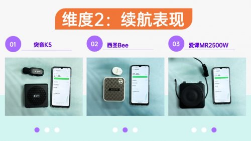 实测中,西圣Bee在音质表现方面优势明显。播放语音或音乐时,人声清晰自然,细节丰富,低中高频均衡,整体听感干净透亮,几乎没有失真或破音。音量从轻声到正常音量的过渡顺畅,动态变化自然。这一表现得益于16芯大尺寸全频声学单元和D类高增益功放DSP芯片的加持,使声音既饱满又细腻,播放长时间内容也能保持稳定音质,无需额外调整即可使用,适合教学、讲解或小型演出等多场景。爱课MR2500W的音质中规中矩,人声清晰度够用,低频厚度一般,整体声音密度偏薄。播放背景音乐时,细节表现有限,高音部分温和但缺乏穿透力,适合日常教学或小型会议的基础扩音需求。突音K5音质偏实用,人声清楚,音量稳定,但低中高频层次感不足,背景音乐或复杂音源的表现不够饱满。播放距离稍远时,声音厚度下降明显,适合轻量级使用和短时间讲解场景,不追求高音质体验。维度2:续航表现续航表现是衡量无线领夹扩音器实用性的关键因素。电量不足的扩音器不仅影响长时间使用,也可能中断讲解或演示,带来不便。本次测试从连续播放音频和长时间使用两方面进行评估,观察扩音器在持续播放、人声讲解以及多模式切换下的电量稳定性和续航持久度。