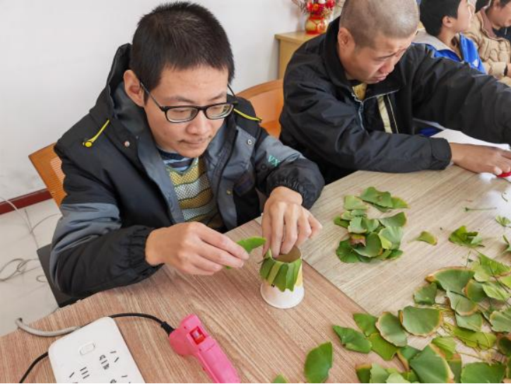 在工作人员的指导下,刚开始,小伙伴们的手法还有些生疏,做出的牡丹“花瓣”略显笨拙。但随着一片片叶子在指尖翻飞,大家渐渐找到了感觉。一弯、一折、一绕,裁剪、拼摆、粘贴,每一个动作都饱含着残障人士对父母深深的爱,正如他们纯真的心灵深处,承载着对家人、亲友的无尽感恩。不多时,欢乐和谐的氛围中,原本朴实无华的落叶,在残友们的巧思与协作下,成为了精美的牡丹花束, 被赋予了新的价值与生命。