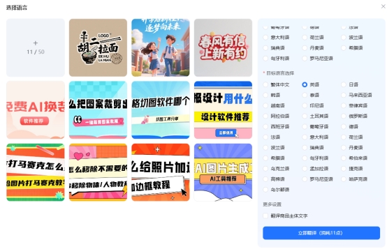 支持批量处理:用户可在操作界面中一次性导入多张需翻译的图片,并分别设置其原始语系和目标语系,然后直接点击按钮就完成批量生成工作,大幅节省了单个图片逐一操作所花费的时间成本。