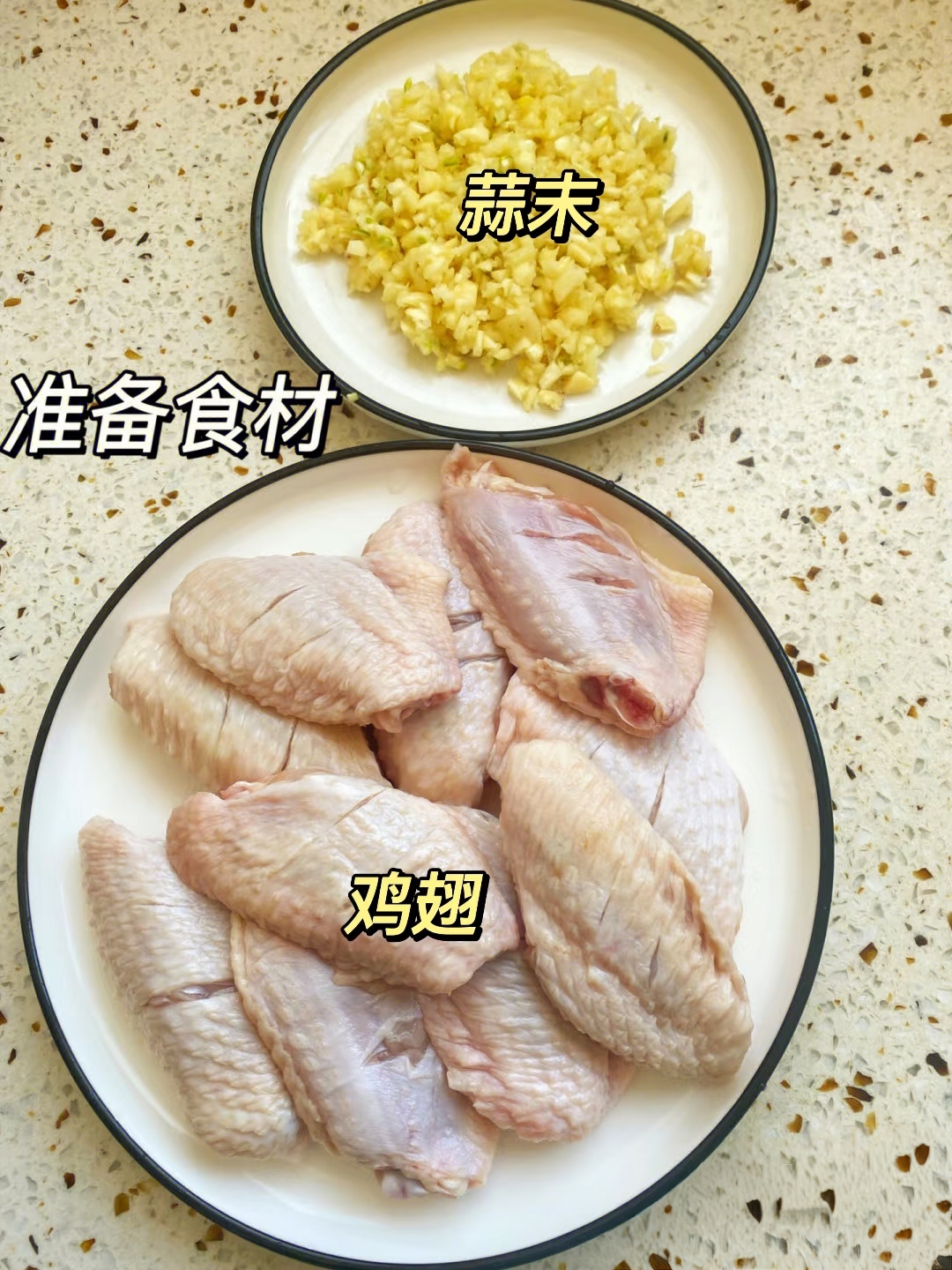 鸡翅中 10个、大蒜 1整头(约10瓣)、生抽、蚝油、料酒、淀粉。