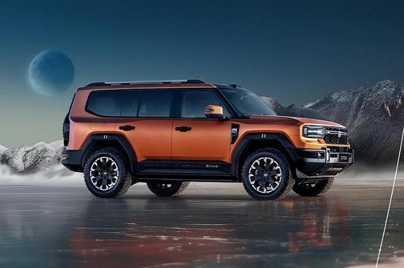 车侧线条平直有力,轮拱宽大且配备全地形轮胎,配合较高的离地间隙,具备更好的通过性。车尾采用外挂式备胎设计,在越野时更实用,搭配双侧电动踏板,兼顾实用性与豪华感。尺寸方面,该车的长宽高分别为5198/2050/1956mm,轴距2870mm。